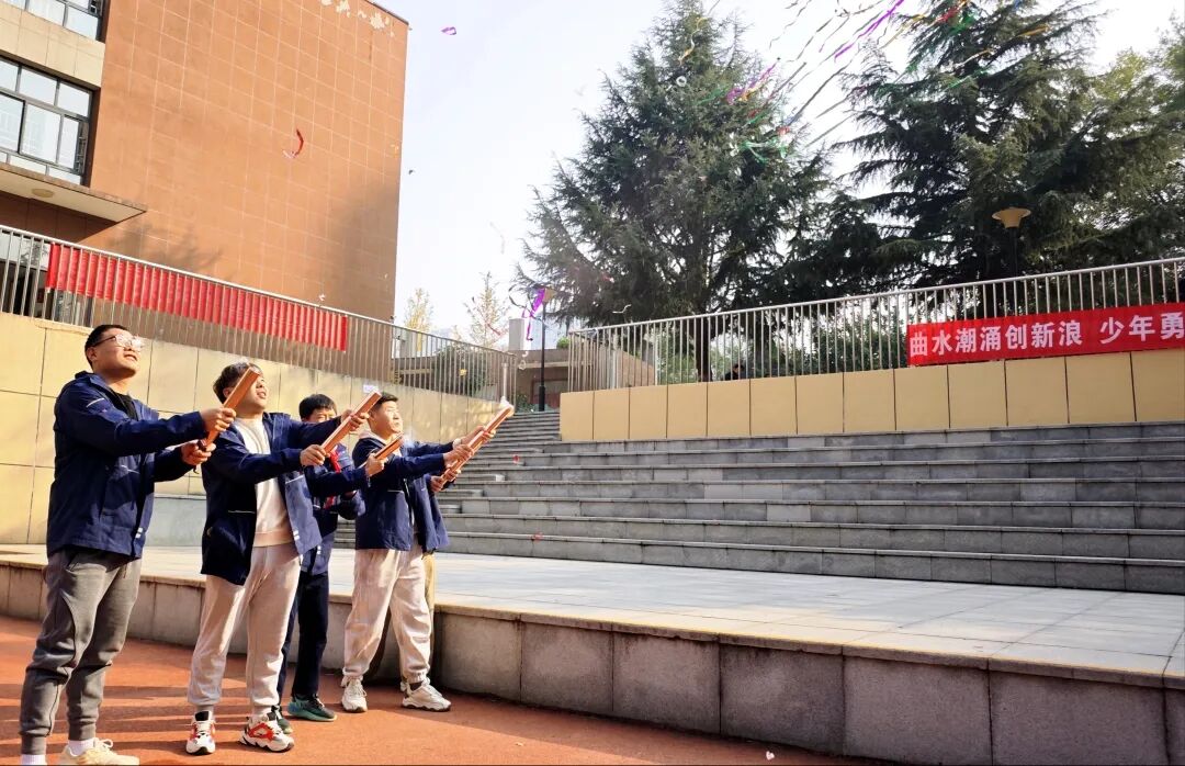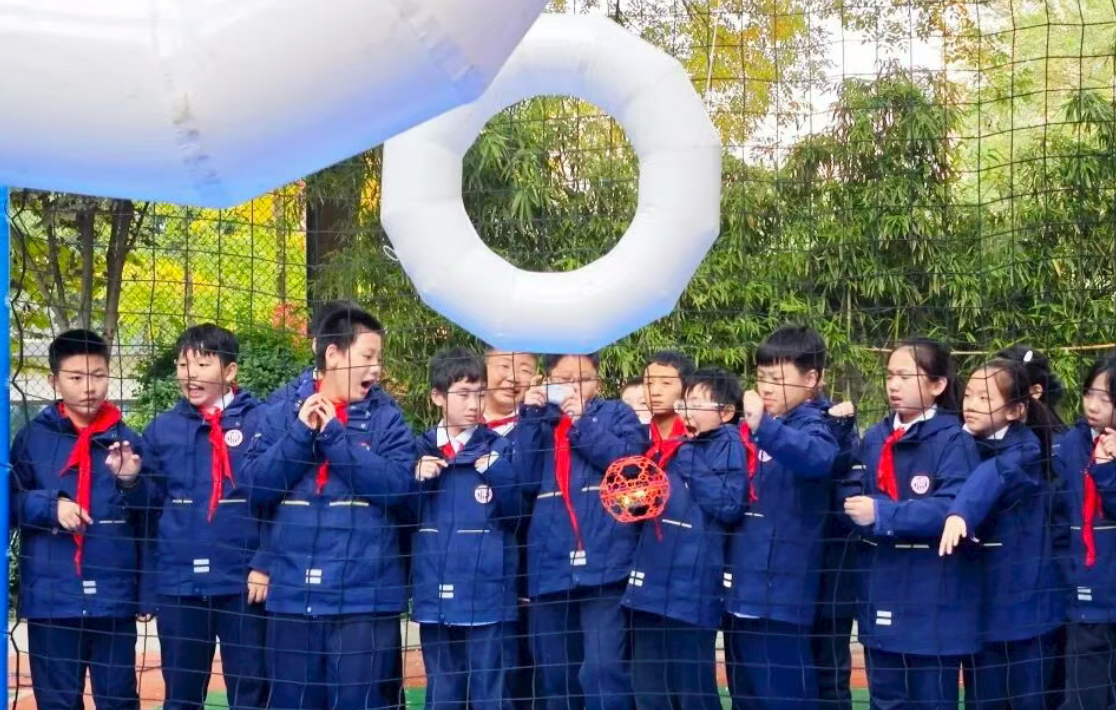五、六年级的“水火箭”挑战赛中,随着发令哨响,一个个自制创意火箭直冲蓝天,引发观赛同学们的高声欢呼。