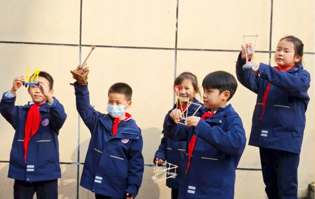 三、四年级的“投石车”挑战赛中,选手们专注调整角度与力度,裁判老师们严谨标记落点、测量距离。