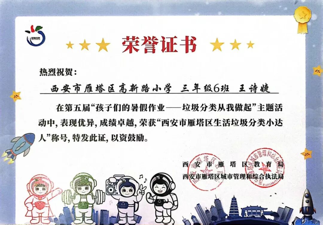 在第五届雁塔区“孩子们的暑假作业——垃圾分类从我做起”主题活动中,该校王诗婕、任紫菱、邓嘉鑫同学积极投身社会实践,将环保理念内化于心,外化于行,取得了优异的成绩,荣获“西安市雁塔区生活垃圾分类小达人”称号!