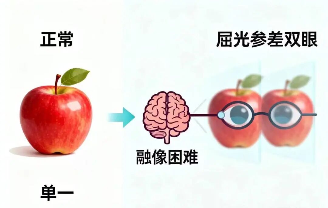 “人类双眼的屈光差别不能过大,如果差别过大,患者双眼分别看到的物像大小过于悬殊,导致大脑无法融合成一个清晰的物象,就会产生视物模糊的感觉,严重时甚至头晕、恶心。由于眼球光学节点的存在,双眼500度的差别根本无法通过佩戴普通框架眼镜来矫正。”张红兵院长解释道。