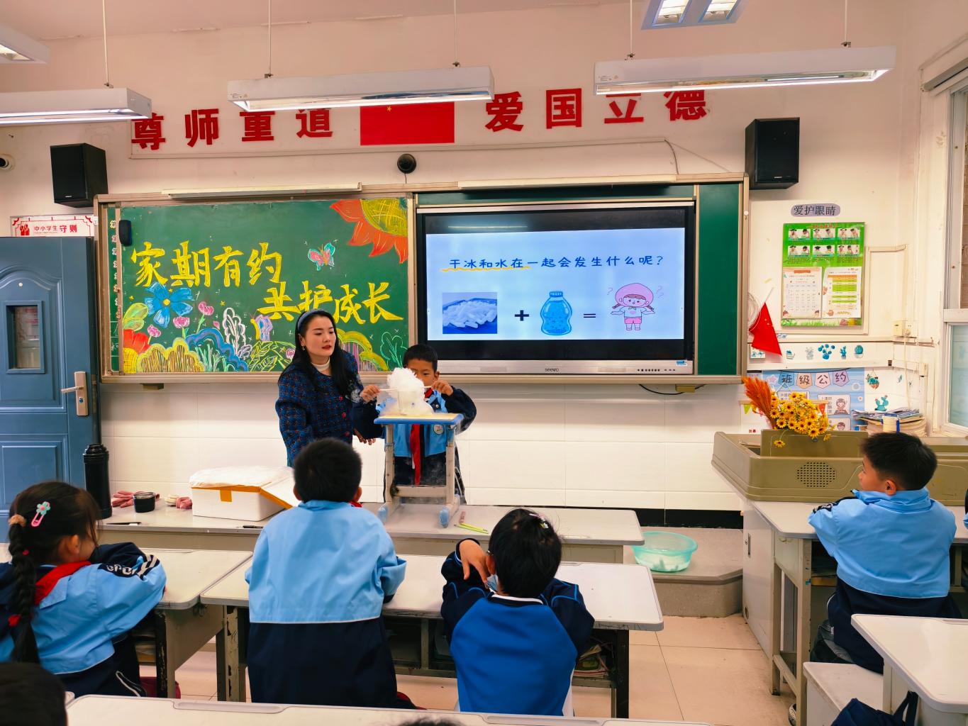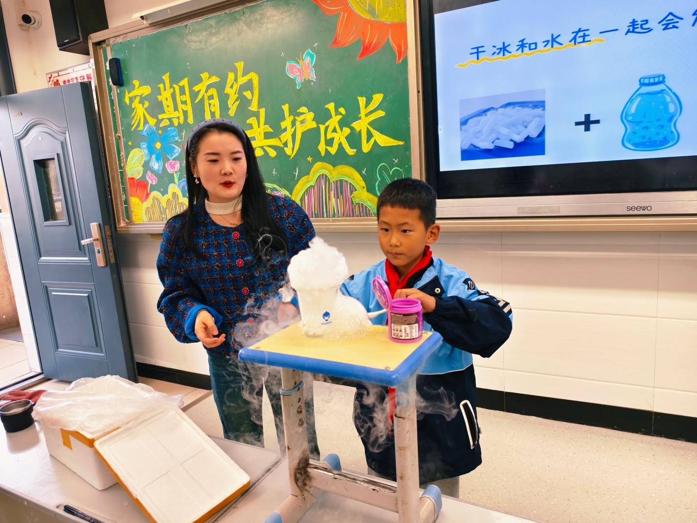 薛沐冉妈妈的课堂飘起“云雾魔法”:她将干冰放入水中,瞬间腾起的白雾让孩子们惊呼“像仙境”,接着讲解“升华”原理,又让孩子在安全范围内触摸干冰周围的低温空气,亲手感受“固态变气态”的奇妙。最后的趣味互动中,孩子们既感受了科学的魅力,又拉近了生活与科学的距离,这样的活动让课堂充满欢乐与探索的乐趣!