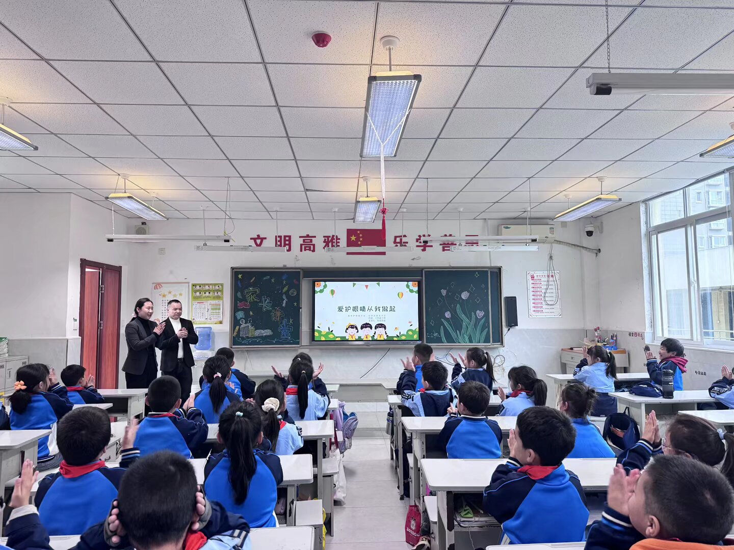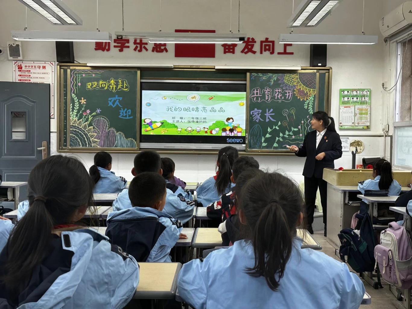章悦爸爸聚焦“护眼指南”:结合“长时间用平板、读写弯腰驼背”的常见问题让学生深知,眼睛是探索世界的明亮窗口。爱护它,离不开每一天的好习惯:读书时端正姿势,与屏幕保持安全距离,多到户外沐浴阳光,为眼睛补充绿色营养。让我们将知识化为行动,把爱护眼睛融入日常,共同守护这扇珍贵的‘心灵之窗’,去拥抱更加清晰、灿烂的未来,孩子们边听边调整,誓要守住“清晰世界”的大门。