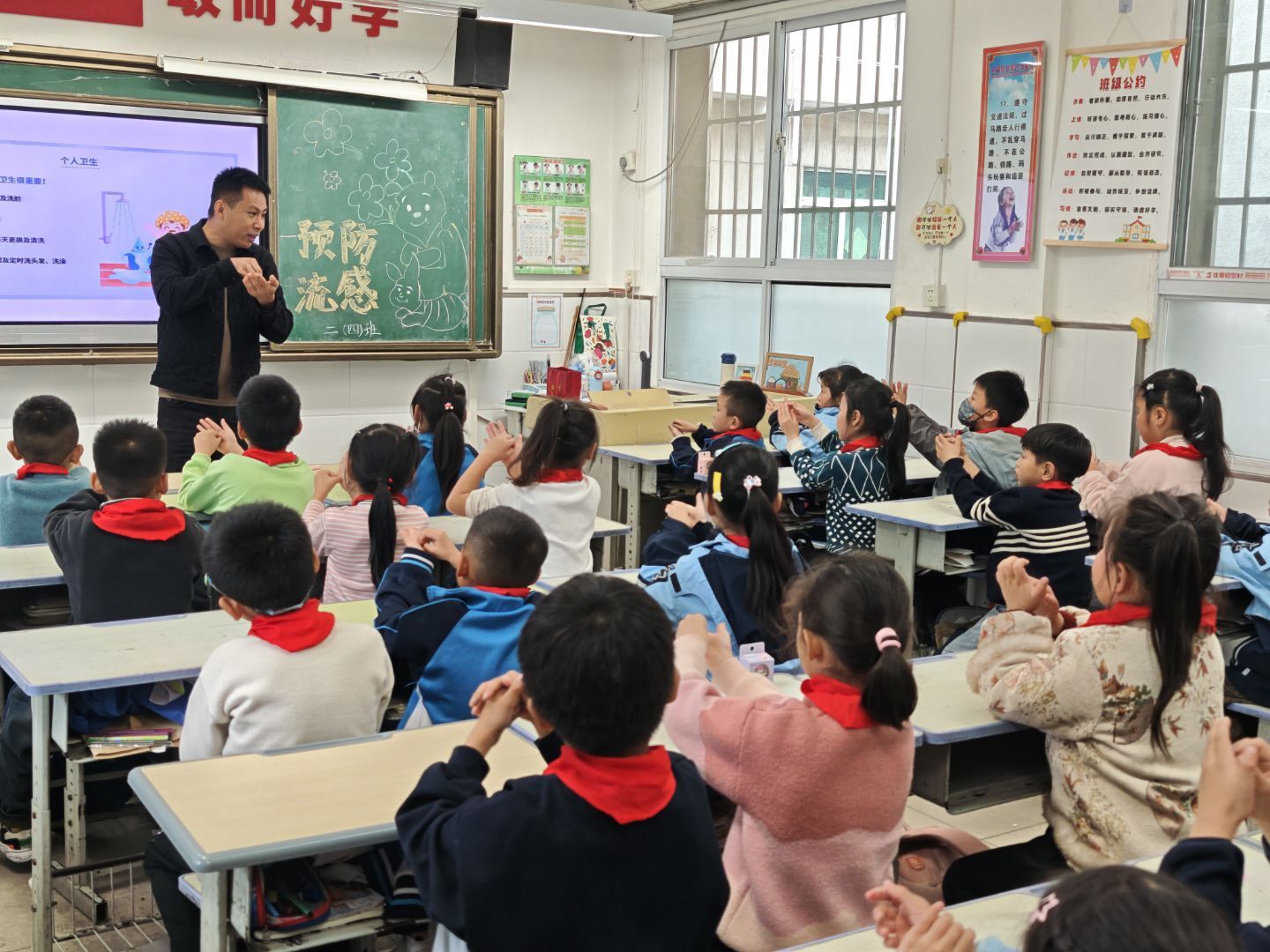 黄灿灿爸爸变身“健康防护教练”:他用卡通病毒模型,讲解流感“怎么从一个人跑到另一个人身上”;接着还教大家“口罩正确戴法”、“教室通风小技巧”以及接种流感疫苗的重要性,把抵御流感的“盾牌”牢牢筑在孩子们心里。