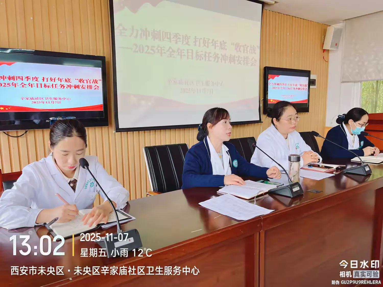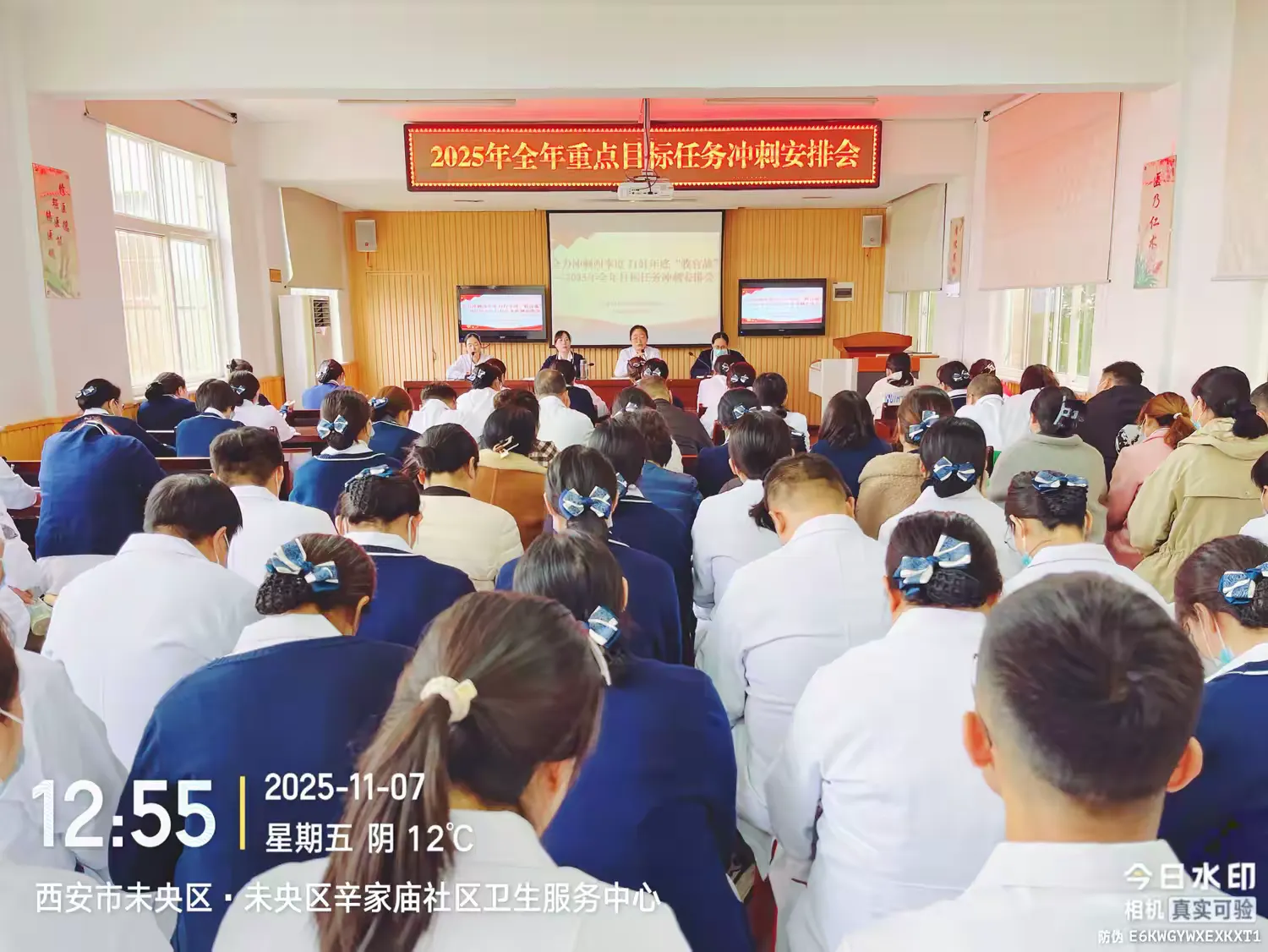 为确保2025年全年目标任务圆满完成,持续优化中心工作服务体系、提升医疗服务质效,2025年11月7日下午,西安市未央区辛家庙社区卫生服务中心组织召开2025年度全年目标任务冲刺安排部署会,中心领导班子成员、各科室负责人及全体职工100余人参会,共同梳理任务进展、剖析现存差距,对重点工作再安排、再部署,为年末工作精准定调、靶向发力。