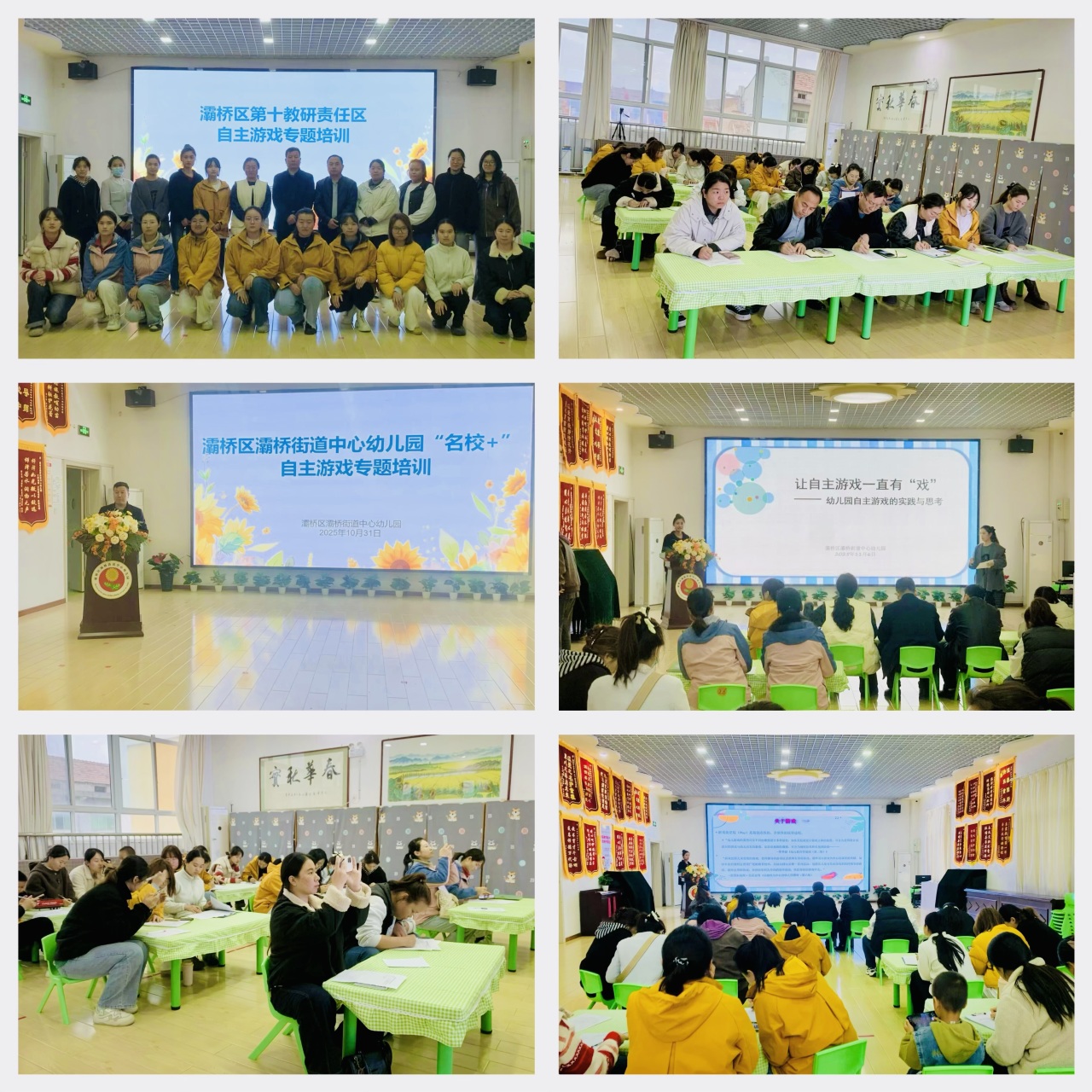 为深入践行《3-6岁儿童学习与发展指南》精神,提升教师对自主游戏的专业理解与实践能力,2025年11月6日,灞桥区灞桥街道中心幼儿园“名校+”组织开展了自主游戏专题培训,“名校+”、灞桥区第十教研责任区教师代表参加。我园骨干教师杨琪从自主游戏的内涵解析、支持性材料、幼儿行为观察解读、教师适度介入策略等方面进行讲解,帮助教师精准把握“幼儿主体、教师支持”的核心原则,掌握科学有效的游戏指导方法。