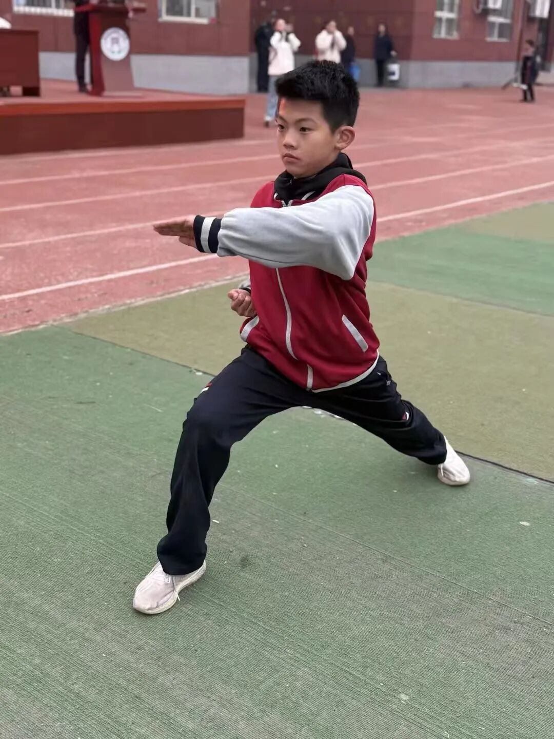 红拳作为国家级非物质文化遗产,是中华武术的瑰宝。比赛现场,同学们凝神聚气,一招一式刚劲有力、舒展大方。抱拳、冲拳、踢腿、转身等动作衔接流畅,时而如猛虎下山气势如虹,时而如青松挺立沉稳坚毅。同学们在一招一式中感悟红拳的刚健质朴,在进退转合中传承武术的精气神,将对传统文化的敬畏与热爱融入每一个动作,赢得现场师生阵阵掌声与喝彩。