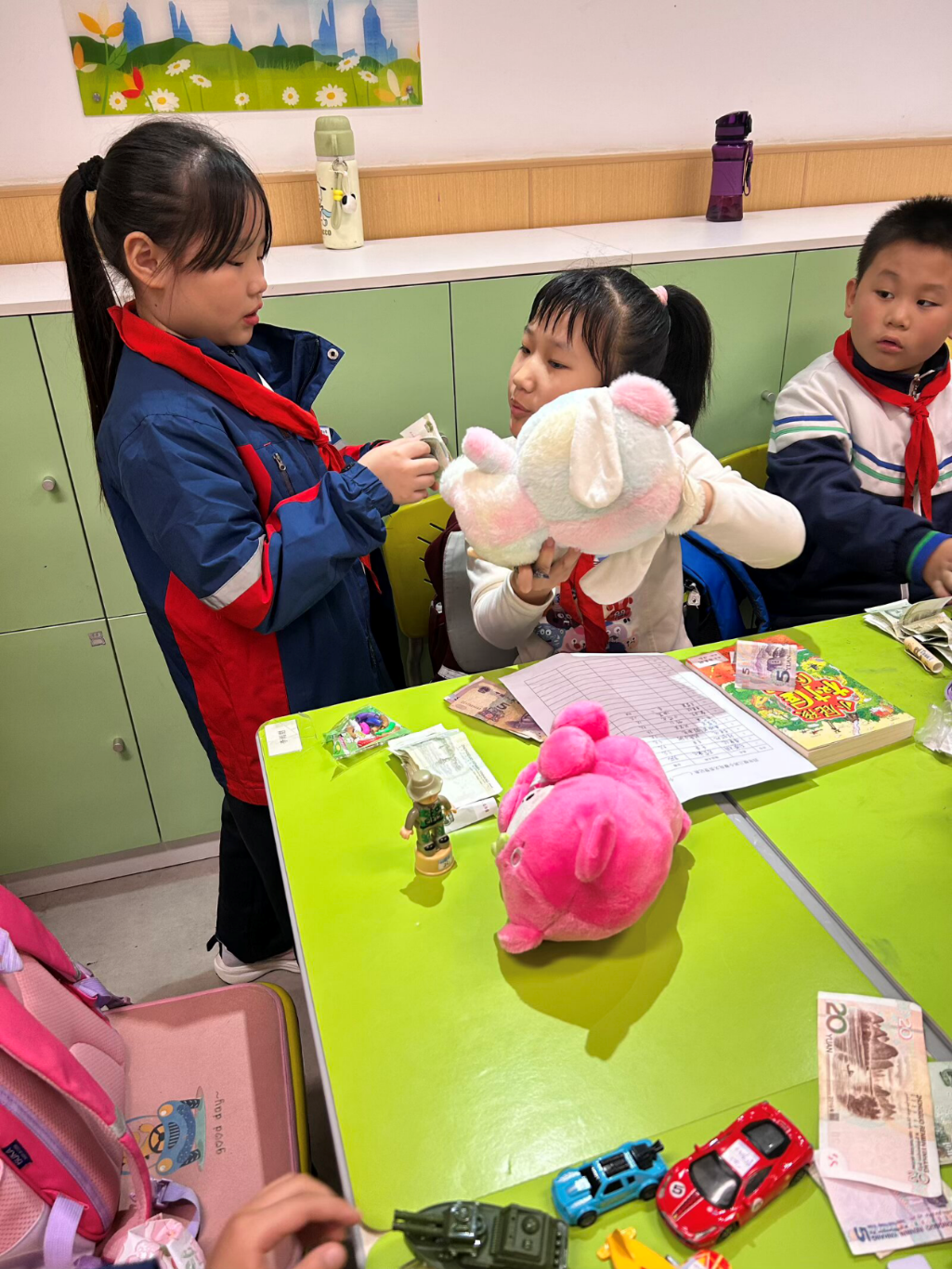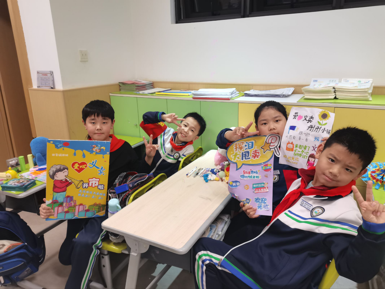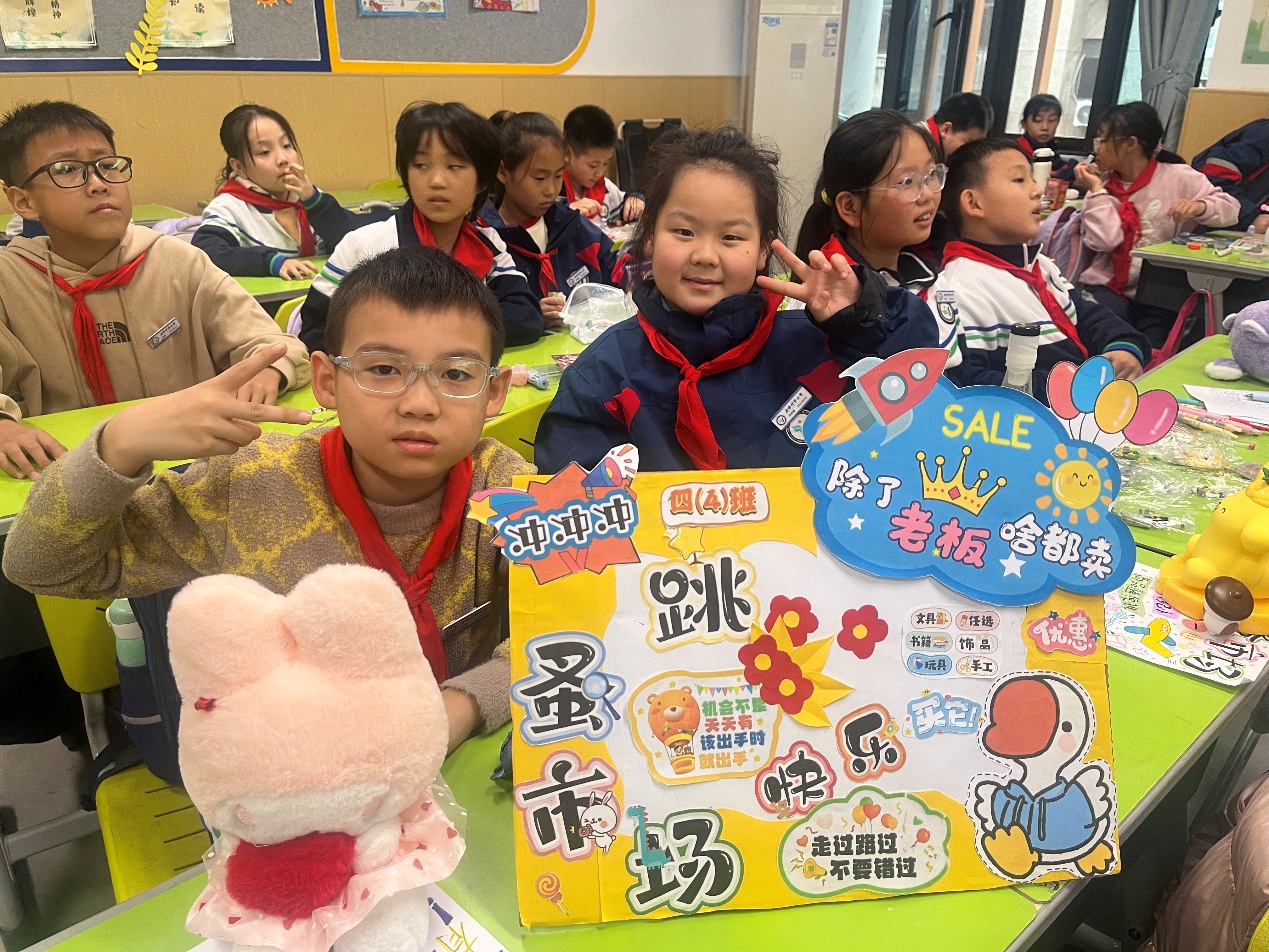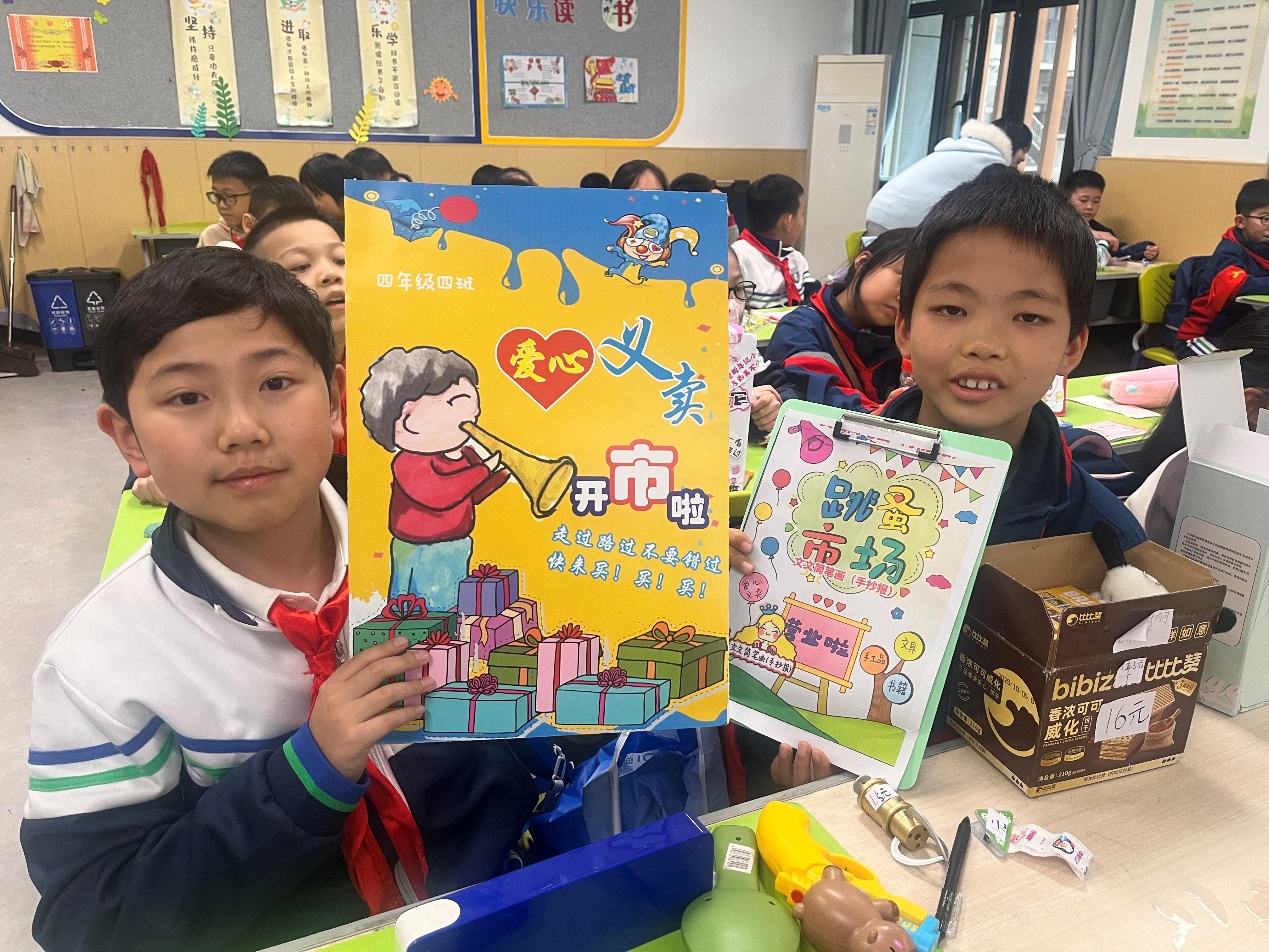 活动前期,在学校的号召下,同学们认真进行义卖筹备工作,大家搜集整理了家里闲置许久的书籍、玩具、手工等物品,亲手设计并绘制了宣传广告牌。此起彼伏的吆喝声、琳琅满目的闲置商品、炫彩夺目的广告牌、来往穿梭的购买者……让四年级的教室显得格外热闹!