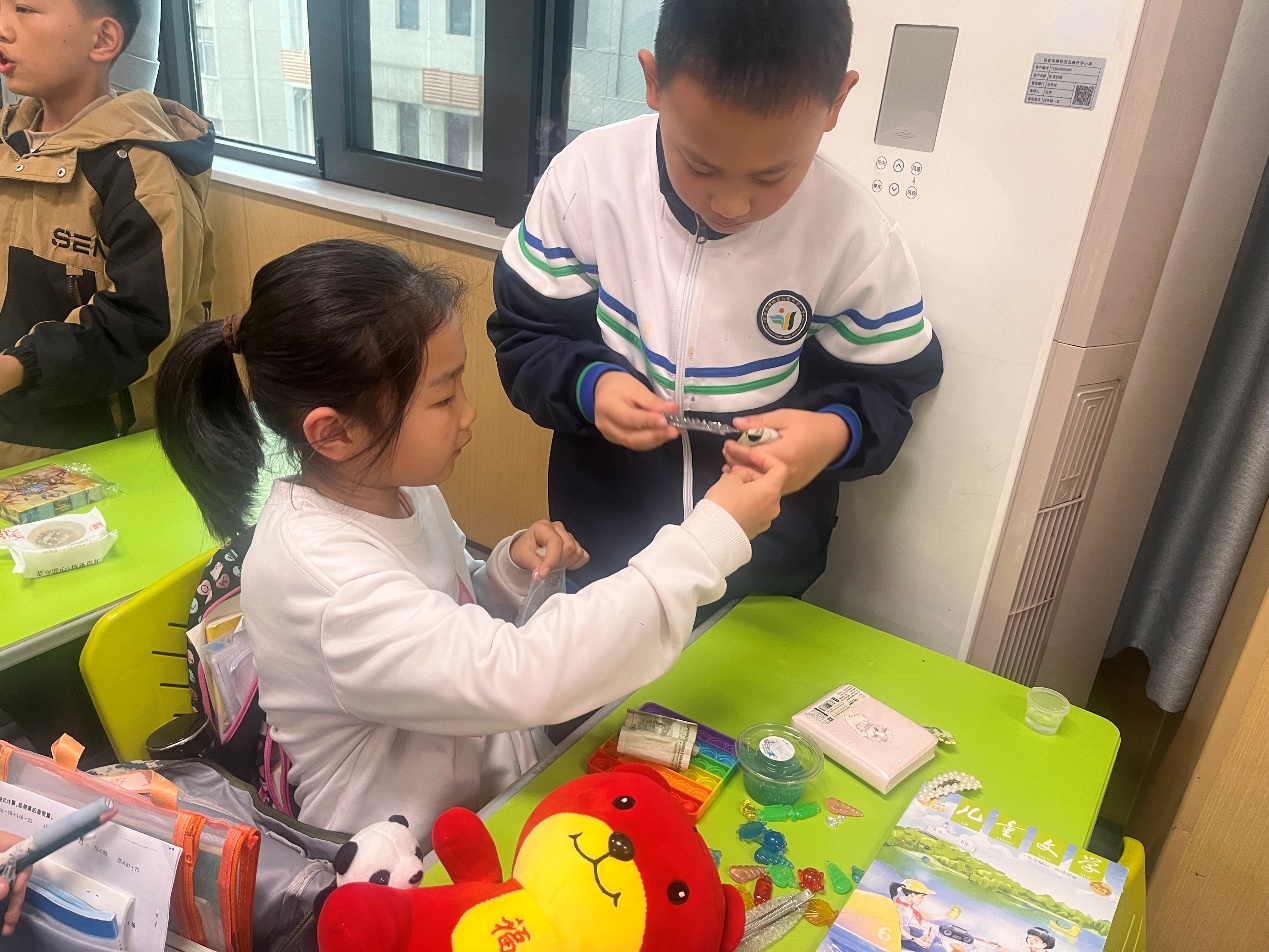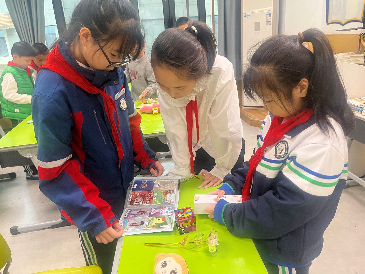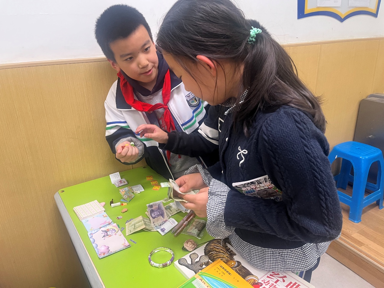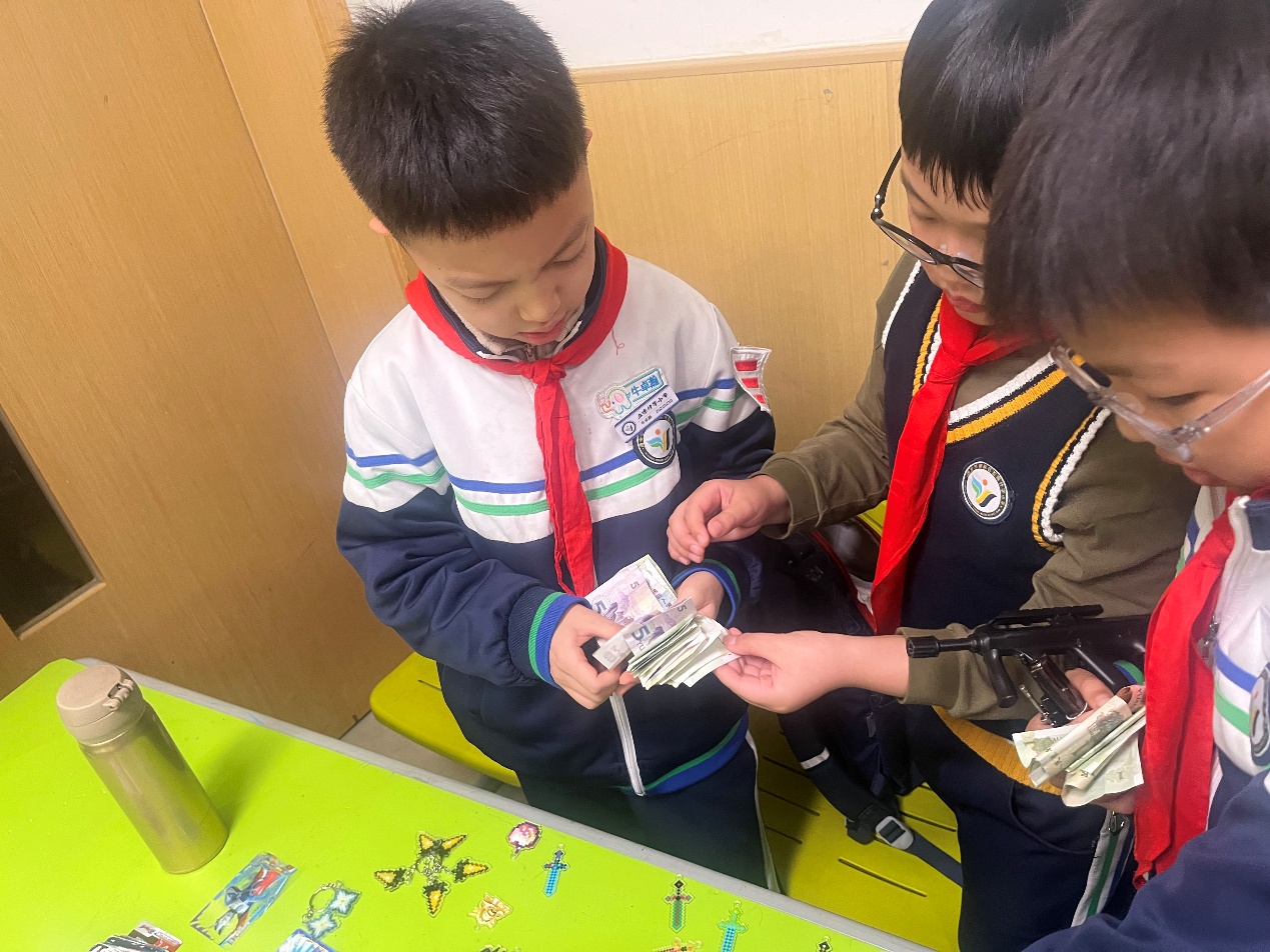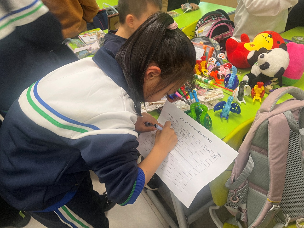 活动前期,在学校的号召下,同学们认真进行义卖筹备工作,大家搜集整理了家里闲置许久的书籍、玩具、手工等物品,亲手设计并绘制了宣传广告牌。此起彼伏的吆喝声、琳琅满目的闲置商品、炫彩夺目的广告牌、来往穿梭的购买者……让四年级的教室显得格外热闹!