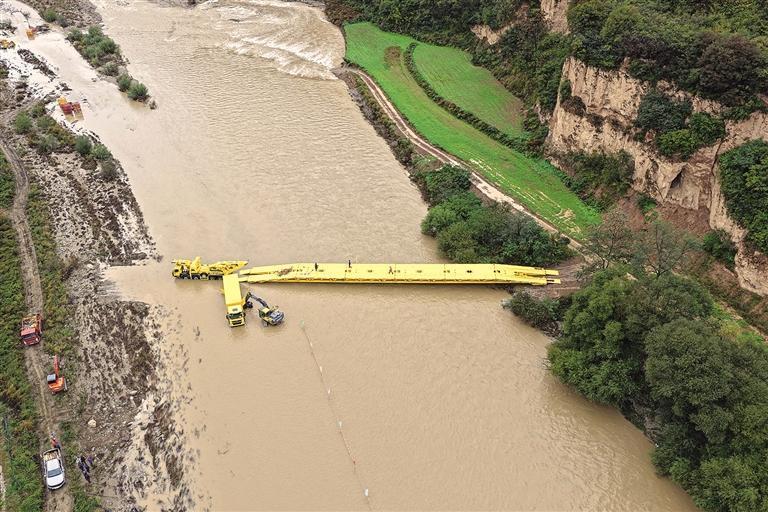 面对严峻形势,10月17日,陕西送变电工程有限公司迅速行动,积极对接中船重工集团应急科技有限公司,并与项目部进行多次沟通,全面研判实际情况,最终确定:架设一座51米大跨度机械桥梁,打通设备与人员通行的关键通道。