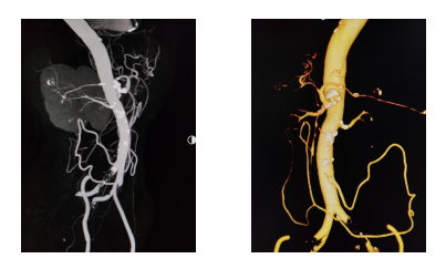入院后,腹部增强CT检查揭示了病情的严峻性——腹腔干动脉开口处存在严重钙化斑块,造成重度狭窄,血管壁坚硬如石;更为棘手的是,肠系膜上动脉竟异常起源于该狭窄段,并已完全闭塞。两条为肠道供血的关键动脉“命悬一线”。