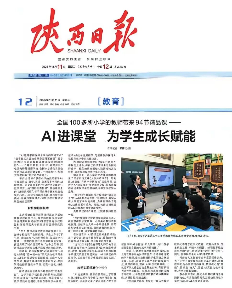 两位教师以饱满的教学热情、娴熟的技术应用能力和灵活的课堂驾驭技巧,完美呈现了浐灞第三十二小学“萤智课堂”课程改革的丰硕成果。他们在课堂上从容自信、循循善诱,既展现了个人深厚的专业素养,更传递了浐灞第三十二小学教师群体潜心教研、勇于创新的精神风貌。此次亮相全国性高峰论坛,不仅是对两位教师个人教学能力的充分认可,更是浐灞第三十二小学课程体系建设成效的有力彰显。陕西日报在对本次活动的专题报道中采用了浐灞第三十二小学教师上课展示的照片。