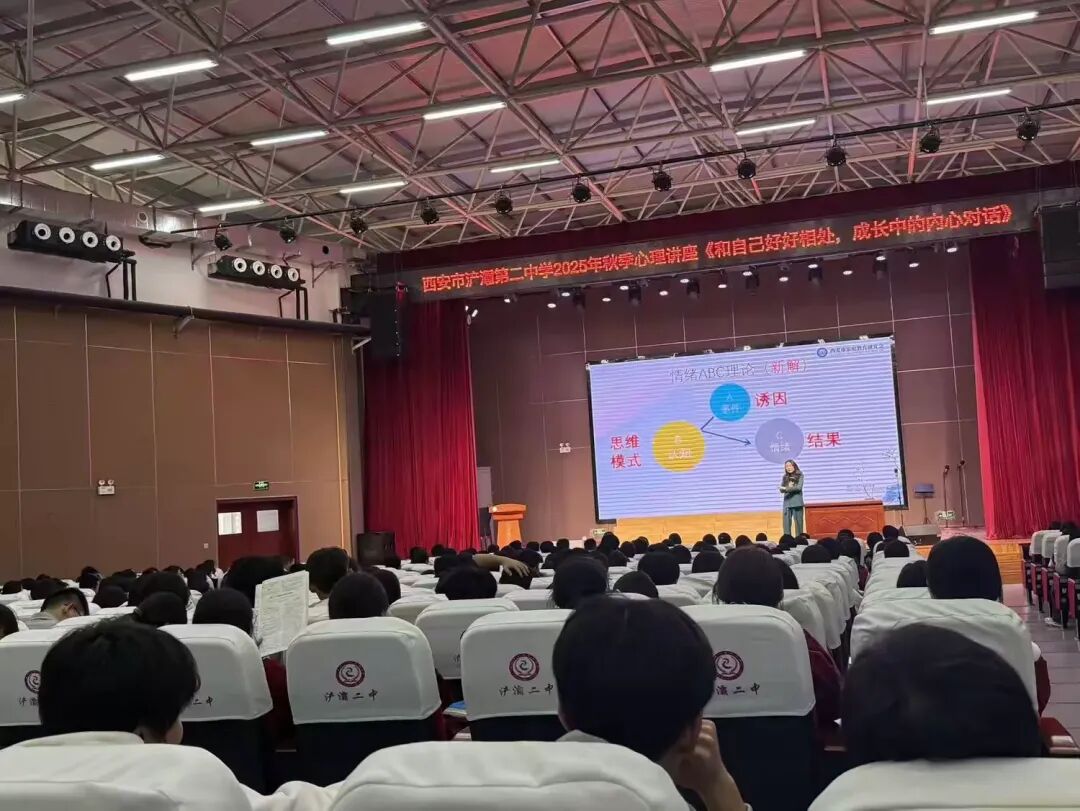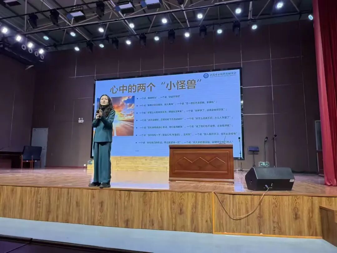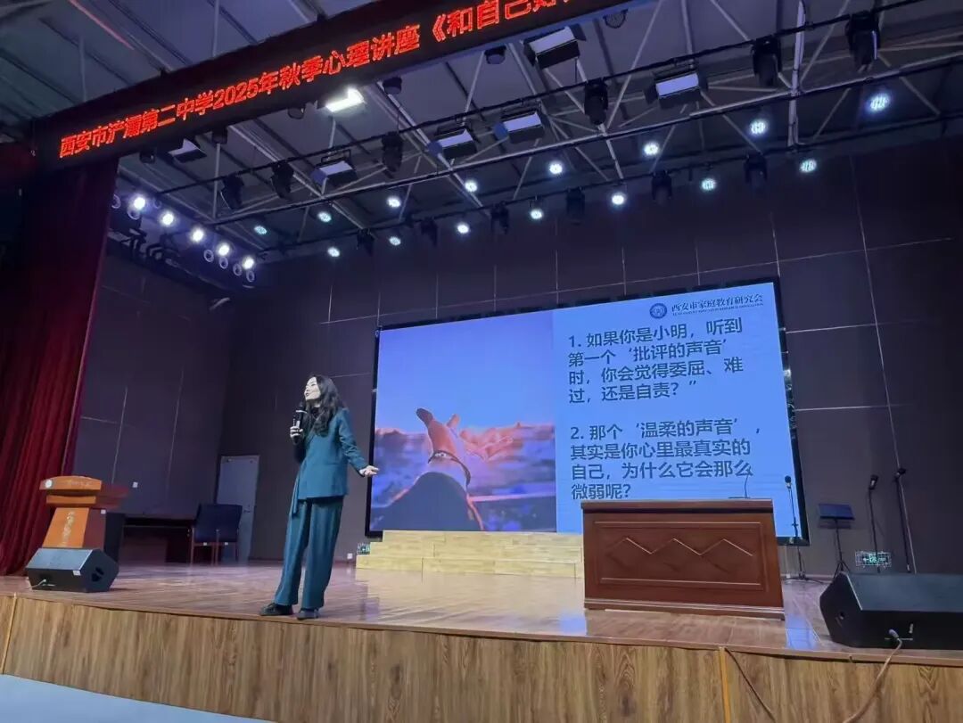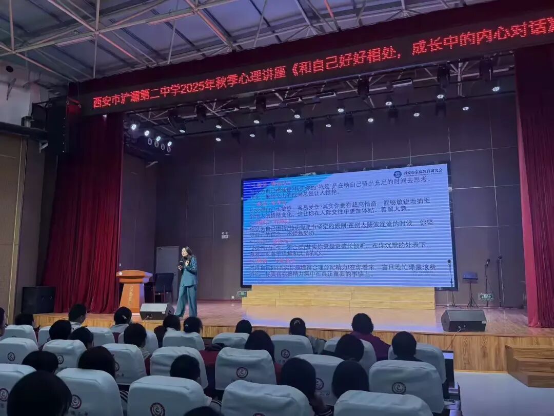 成长路上,我们总在和内心的两个 “小怪兽” 拉扯—— 一个鼓励我们勇敢尝试,一个却不断否定质疑。为了帮助同学们破解内心矛盾,学会与自己好好相处,2025年11月3日,西安市浐灞第二中学特别邀请了家庭教育领域资深专家张青老师带来主题为 “和自己好好相处:成长中的内心对话” 的心理健康讲座。现场座无虚席,同学们齐聚一堂,在张老师温暖的引导下,开启了一场探索自我、接纳自我的心灵之旅。