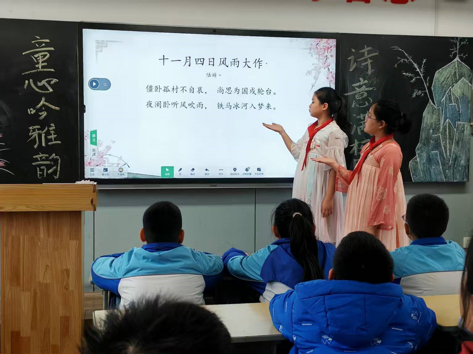 黄河小学以诗词校本课程为核心,创新构建 “1+8” 诗词育人体系,让诗词融入校园每个角落。课后服务时段,诗词社团带领学生深耕细研,探寻诗词背后的文化密码;放学路队中,孩子们的吟诵声此起彼伏,让诗意伴随归家之路;校园廊亭被诗联书画装点,每一步都能邂逅墨香雅韵;课前三分钟的经典诵读,成为每日启智润心的必修课。学校还在传统节日组织吟诗作对、开展诗词创作竞赛、在队部活动中设置诗词展示环节,更让学子走上社区舞台传扬诗香,联结起家庭、学校与社会的教育合力,打破时空界限让诗词扎根心灵。