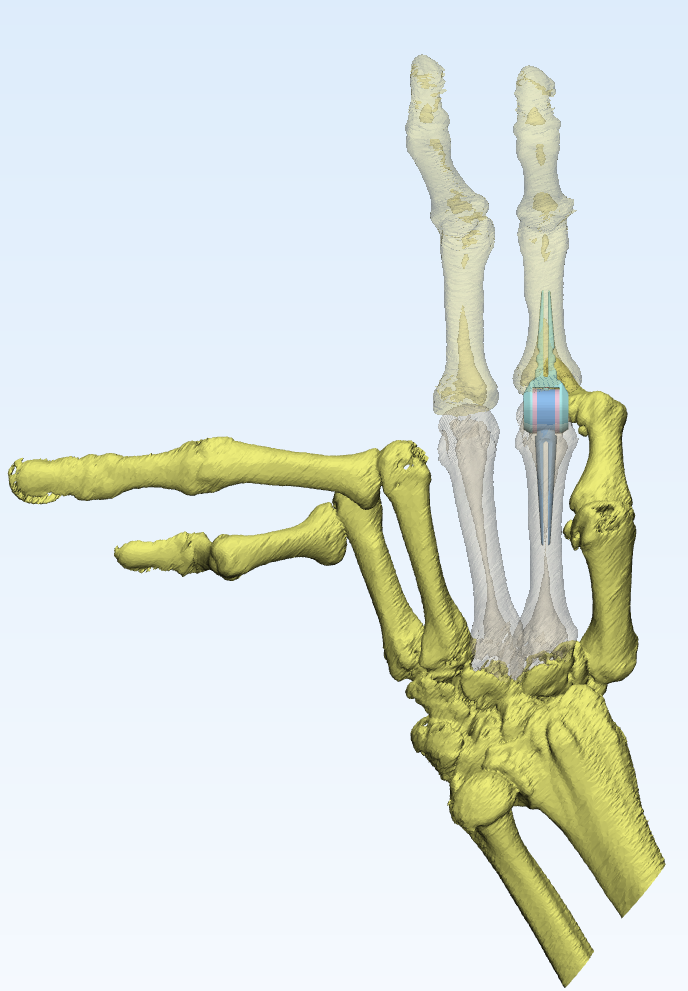 手术如期开展。团队按照术前规划,以微创切口逐层分离组织,小心翼翼避开指神经和血管束,直达受损掌指关节处,精准剔除被炎症侵蚀的病变组织,清除致病“元凶”。随后,将定制好的钛合金假体缓缓植入,关节柄稳固嵌入骨骼,关节头完美贴合软组织,整个过程如同“精密的机械组装”,每一个流程都严格按照前期制定的设计参数实施。