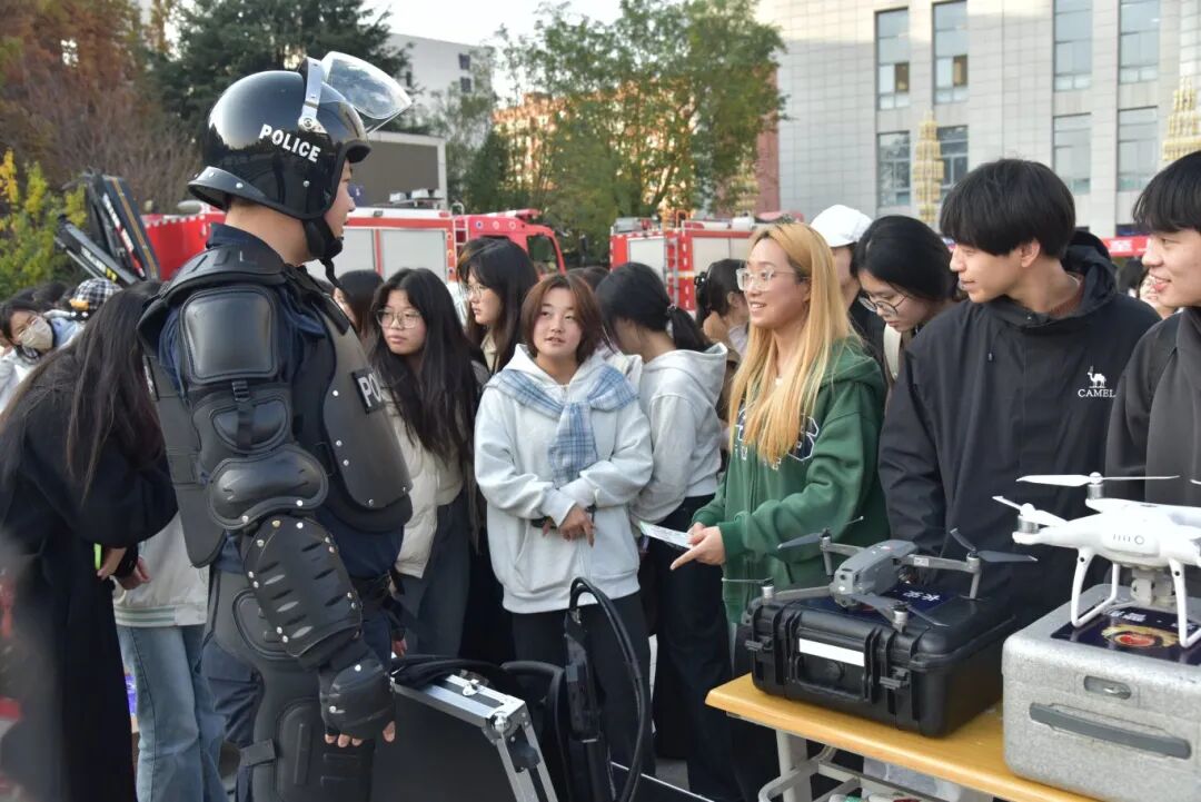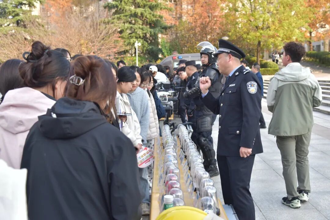 此次活动最受学生欢迎的,当属户外的“主题互动观摩体验区”。为增强活动的趣味性与参与感,分局反恐怖和特警大队、刑侦大队、常宁路派出所及消防长安大队等单位在学校图书馆广场上设置了装备展示区、展板学习区和互动体验区,让广大师生近距离接触警务科技装备和消防专业设备,现场人声鼎沸,气氛热烈。