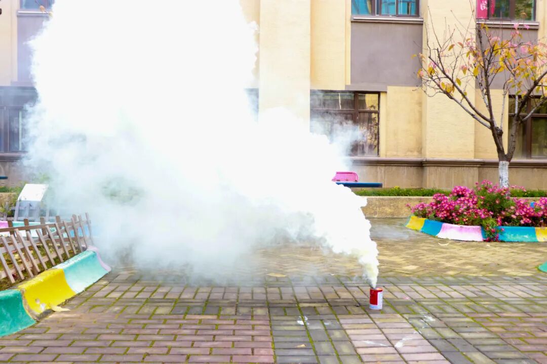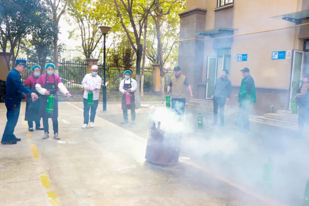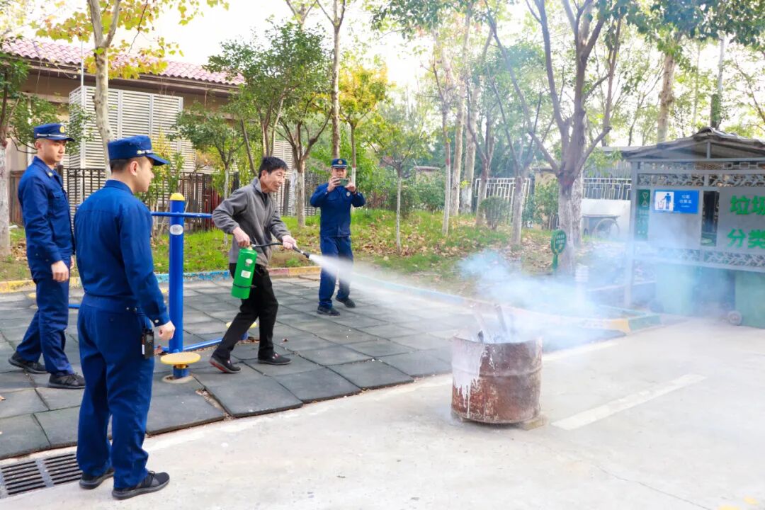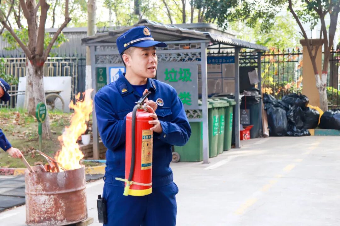 消防队员现场演示灭火器使用方法,强调“站在上风处、握胶质喷管、对准火源根部按压”等关键要点,还特别提醒“室内使用后需加强通风,扑灭电器火灾先切断电源”。学校工作人员依次上阵,在燃烧的铁桶旁开展实战练习,消防队员“手把手”纠正动作,确保大家熟练掌握灭火技巧。