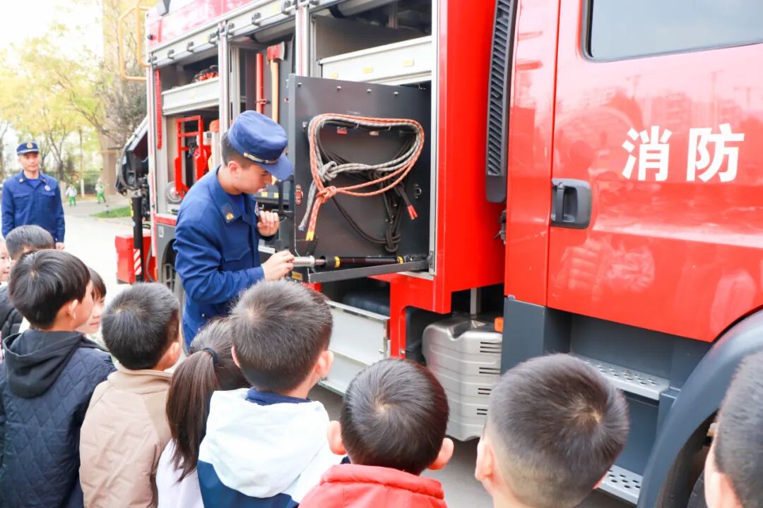 最让同学们期待的“探秘消防车”环节如约而至。消防队员打开车厢,逐一展示高压水枪、破拆工具、急救箱等“救援神器”,细致讲解其功能与使用场景:“这根水带能快速铺开,射程可达几十米,火灾现场能精准供水灭火”“这个破拆工具能轻松切开障碍物,为救援争取宝贵时间”。