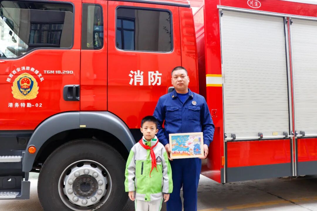 疏散演练结束后,国际港务区消防救援大队奥体中心消防救援站何刚强老师为同学们带来一节生动的消防知识安全讲座。同学们怀着崇敬之心,为现场的消防嘉宾送上亲手绘制的消防主题绘画作品,一笔一画都饱含着对消防英雄的敬意。全校学生整齐列队,高举右臂行队礼,用最真挚的方式向“火焰蓝”致敬!