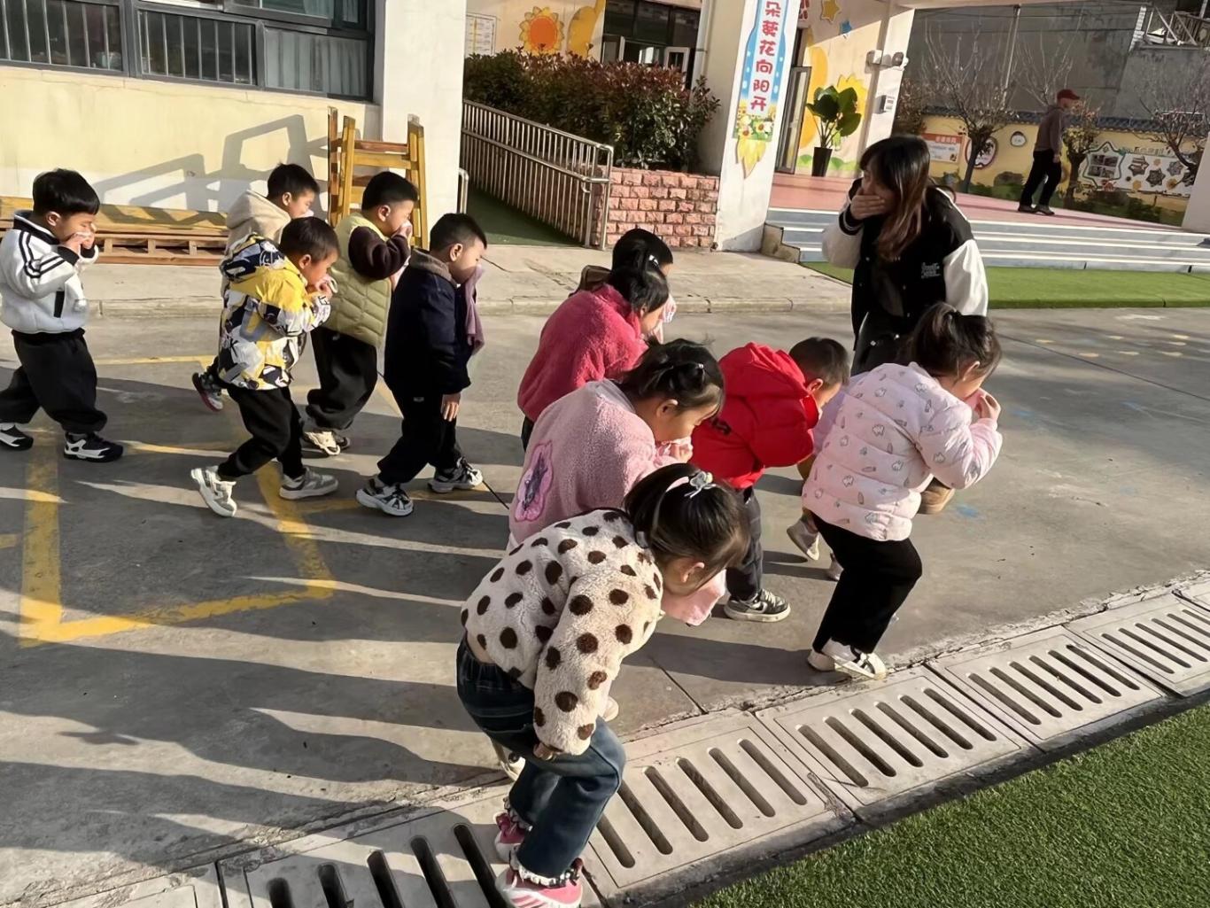 警报声响起,所有教师迅速带领孩子们用湿毛巾捂住口鼻、弯腰低身,按疏散路线紧急撤离。