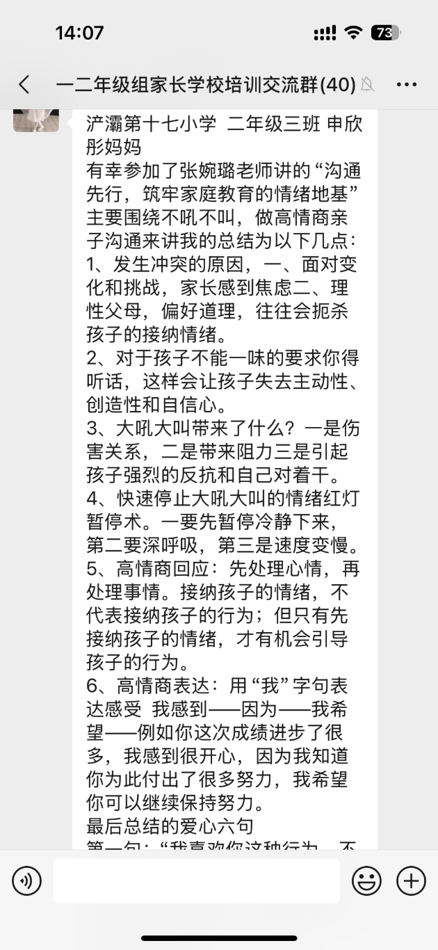讲座结束后,家长们纷纷在年级群中分享心得体会。有的反思“过去的关心成了孩子的压力”,有的计划“回家先听再说”。一句句真诚的感悟,是家庭教育意识的觉醒,更是家校共育理念的生动实践。