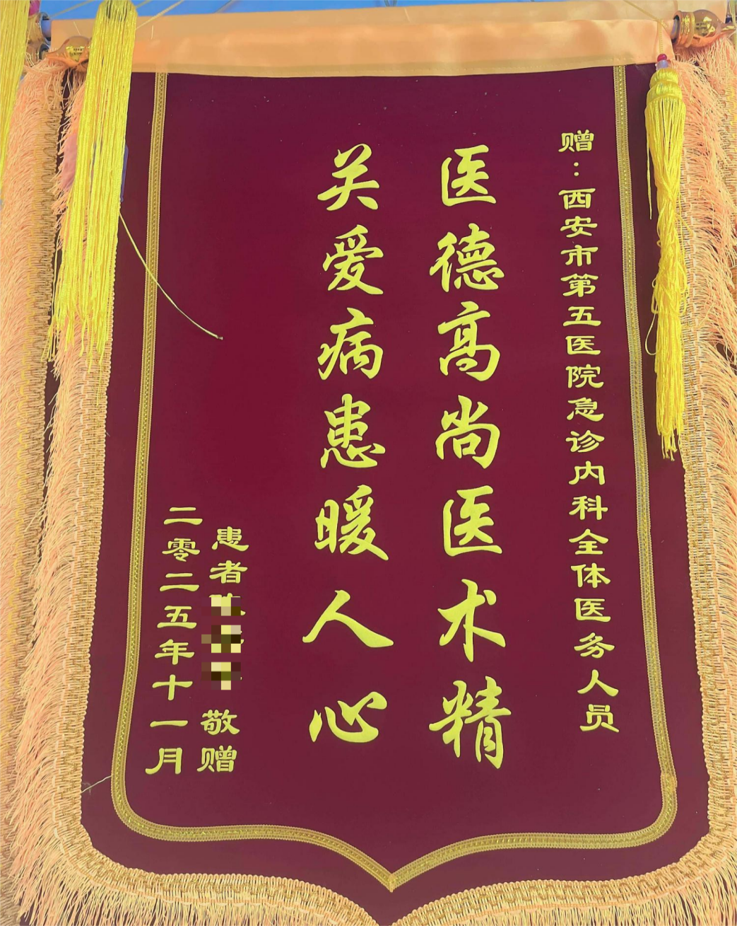 阳光讯(记者 郑亚雷 通讯员 陈肖)在西安市第五医院急诊科的医生办公室里,一面崭新的锦旗格外引人注目。红彤彤的绒面上,两行金黄的大字“医德高尚医术精,关爱病患暖人心”熠熠生辉。这面锦旗,承载着一个家庭历经生死考验后的无限感激,见证了一场与时间赛跑、最终赢得胜利的生命奇迹,更是一曲由患者、家属和西安市第五医院医护人员共同谱写的生命赞歌。