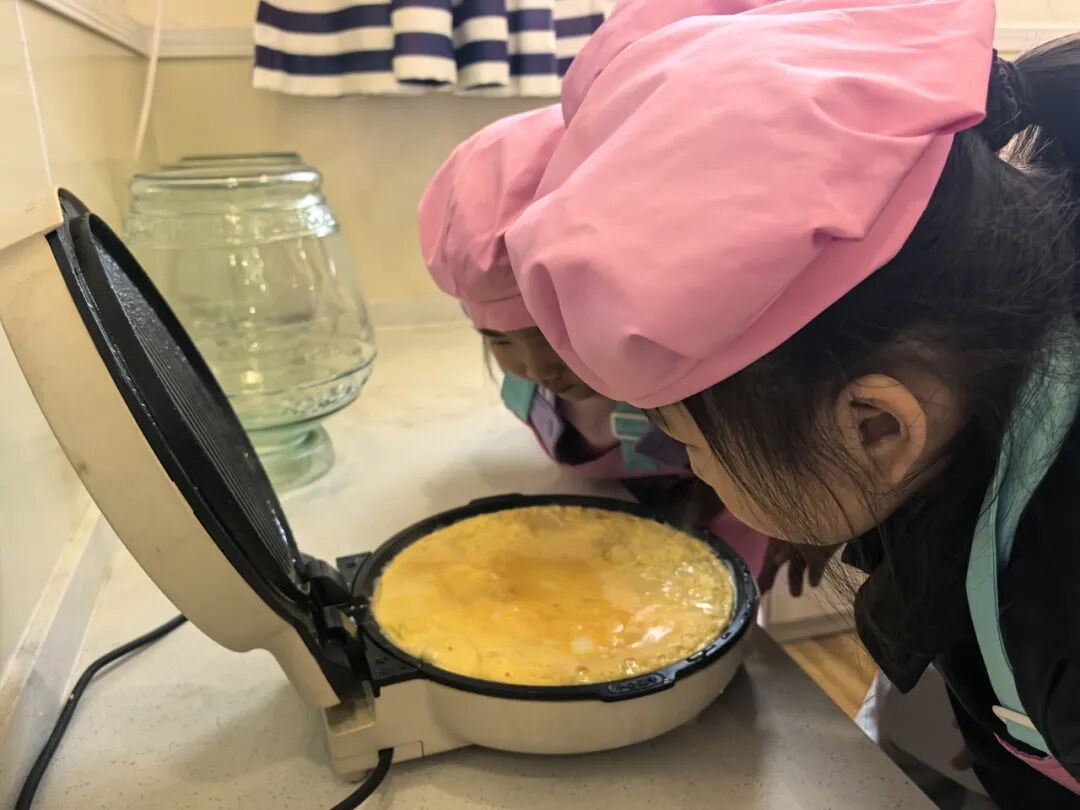 捡完鸭蛋,宝贝们又转战到了幼儿园的“小厨房”。在老师的指导下,大家分工合作:有的负责清洗鸭蛋,小手在水流下轻轻揉搓;有的踮着脚尖打蛋液,虽然偶尔会溅出几滴,但脸上依旧满是认真;还有的帮忙搅拌面粉,小胳膊抡得有模有样。当蛋液倒进热油的锅里,发出“滋滋”的声响,香气瞬间弥漫开来,孩子们的眼睛里都闪着期待的光。