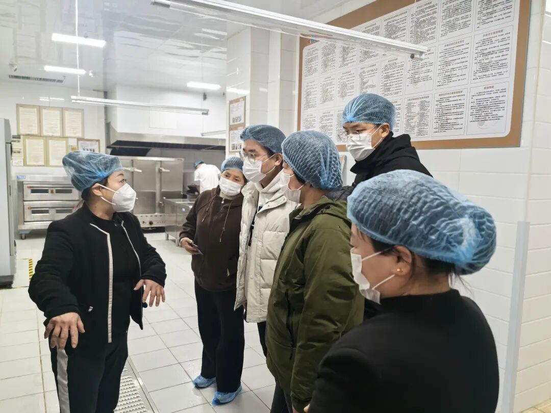 在王主任的陪同下,一行人深入幼儿园食堂的各个功能区域进行实地参观。王主任详细介绍了粗加工区、操作区、留样区、配餐间、洗消间等区域的日常运作情况,并重点讲解了食堂工作人员履职、餐饮具清洗消毒、食品留样以及物品分类摆放等关键环节。