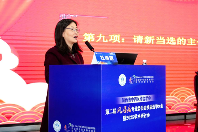 新当选的主任委员杜娟丽做就职表态发言,她表示,以此次连任为新起点,带领全体委员在风湿病领域不断探索,守正创新,团结协作,共同推动风湿病中西医结合的融合,引领陕西中西医结合风湿病学科发展,作出成绩,尽心尽力为人民健康服务。