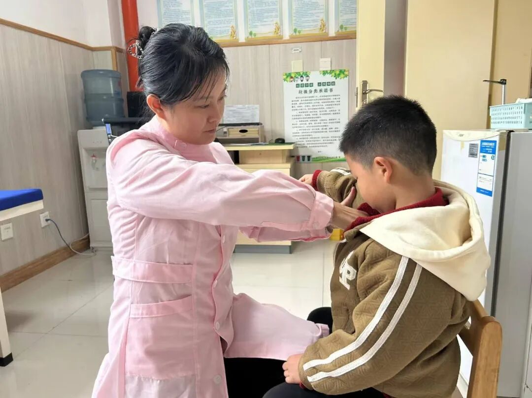 保健老师对幼儿进行体温测量及检查,安抚幼儿情绪。