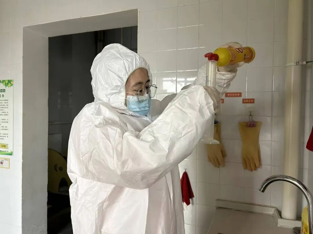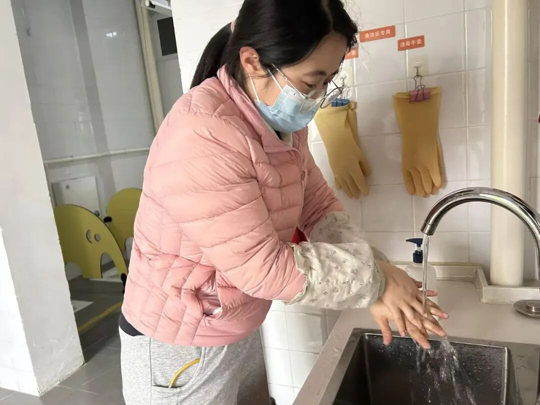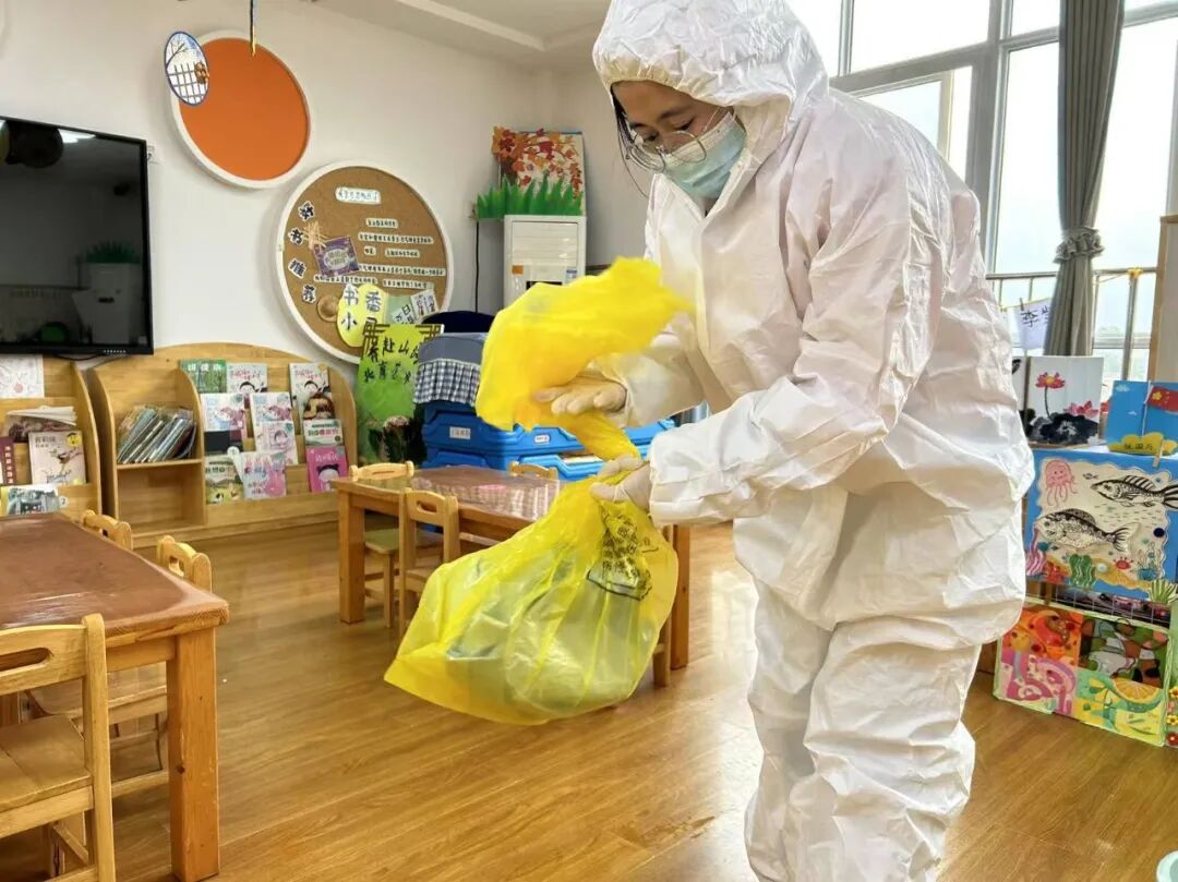 同时指导保育老师戴口罩帽子做好个人防护,用5000mg/L含氯消毒液对呕吐物进行全覆盖消毒处理,覆盖后开窗通风,使室内外空气流通。将幼儿呕吐物经消毒处理后装入无渗透医疗垃圾袋内并对班级环境进行终末消毒。