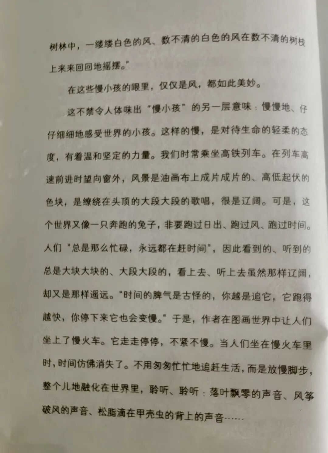 翻开书页,首先映入眼帘的是曹文轩先生为这本书撰写的序言。序中写道:“慢,是现实的一种状态。慢小孩的‘慢’,不仅指成长的速度,更指成长的过程。慢小孩的另一层含义是:那些慢慢地、仔仔细细地感受世界的小孩。这样的‘慢’,是对待生命的一种轻柔态度,蕴含着温暖和坚定的力量。