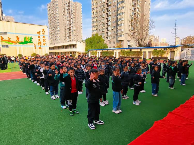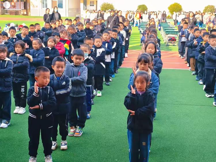 紧接着,一年级全体学生整齐列队,带来充满童趣与活力的手势舞——《一年级》。音乐响起,孩子们面带笑容,动作整齐划一,指尖跃动着自信与快乐。“我是小学生啦!”一句句歌词唱出他们内心的自豪,一个个动作传递着成长的力量。阳光洒在他们身上,仿佛为这纯真的画面镀上金边,感染了在场每一位观众。