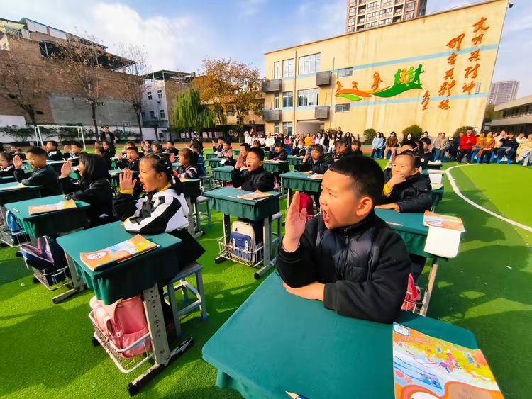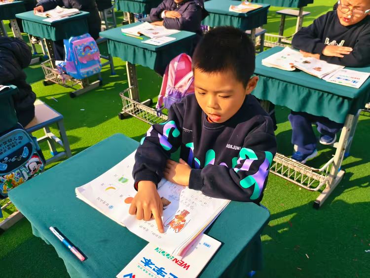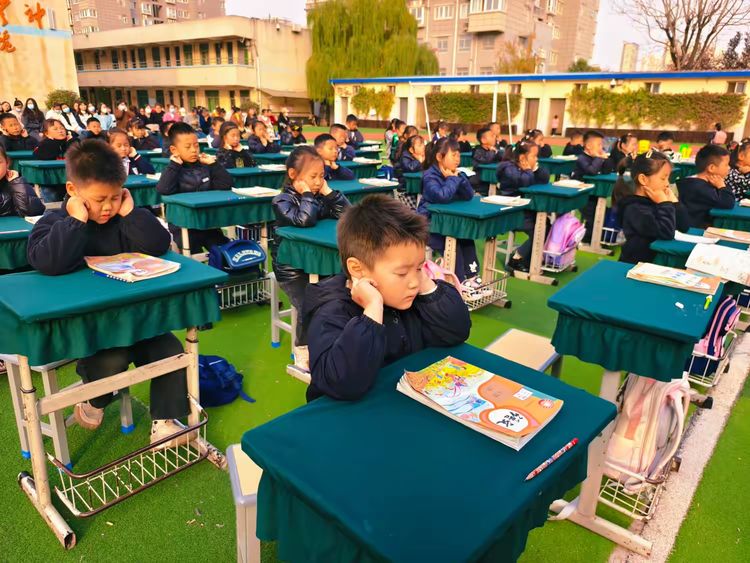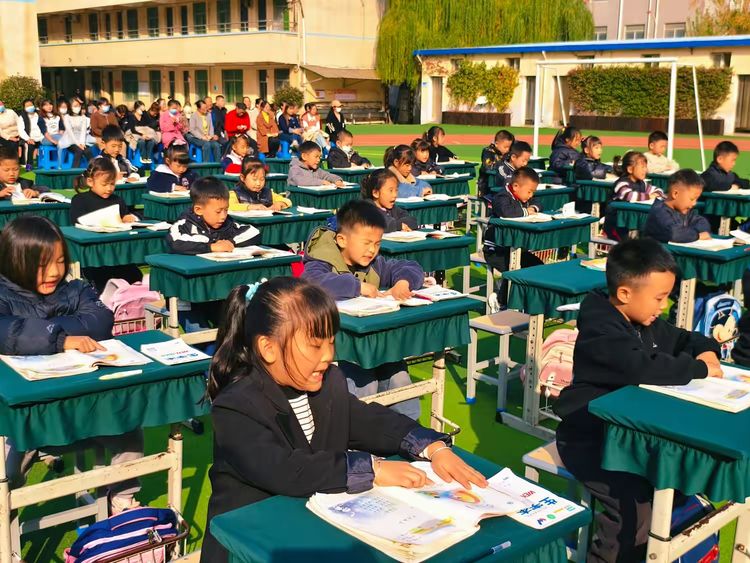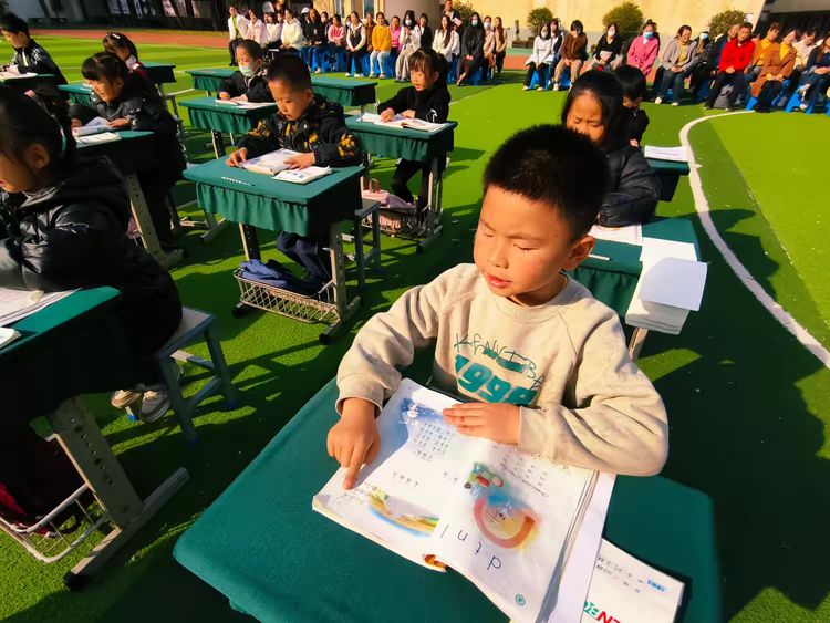 各班学生端坐,统一诵读语文课本中的经典课文与古诗。一声“晨读开始!”指令清晰有力,孩子们齐声朗读,声音洪亮、节奏一致。坐姿挺拔,双手捧书,眼神专注,展现出良好的学习状态。阳光映照在一张张认真的小脸上,书香气息扑面而来。