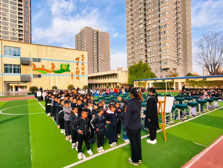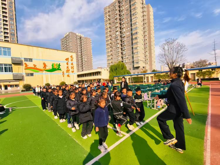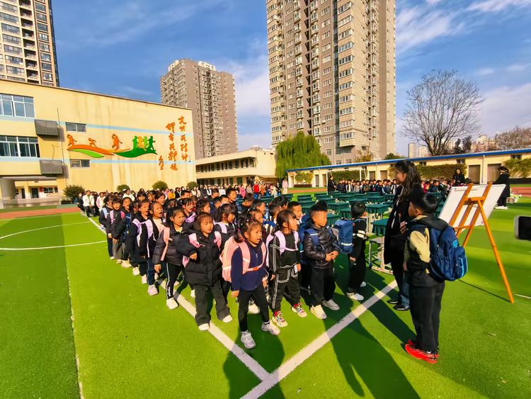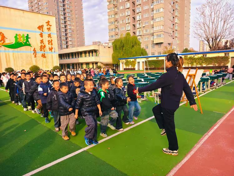 体育张老师带领全年级学生进行队列展示。一声声口令铿锵有力:“立正!”“稍息!”“向前看齐!”孩子们迅速反应,动作利落。随后绕场行进一圈,队伍整齐划一,步伐坚定,口号嘹亮:“一二三四,团结奋进!一二三四,勇往直前!”青春的气息在操场上肆意飞扬。