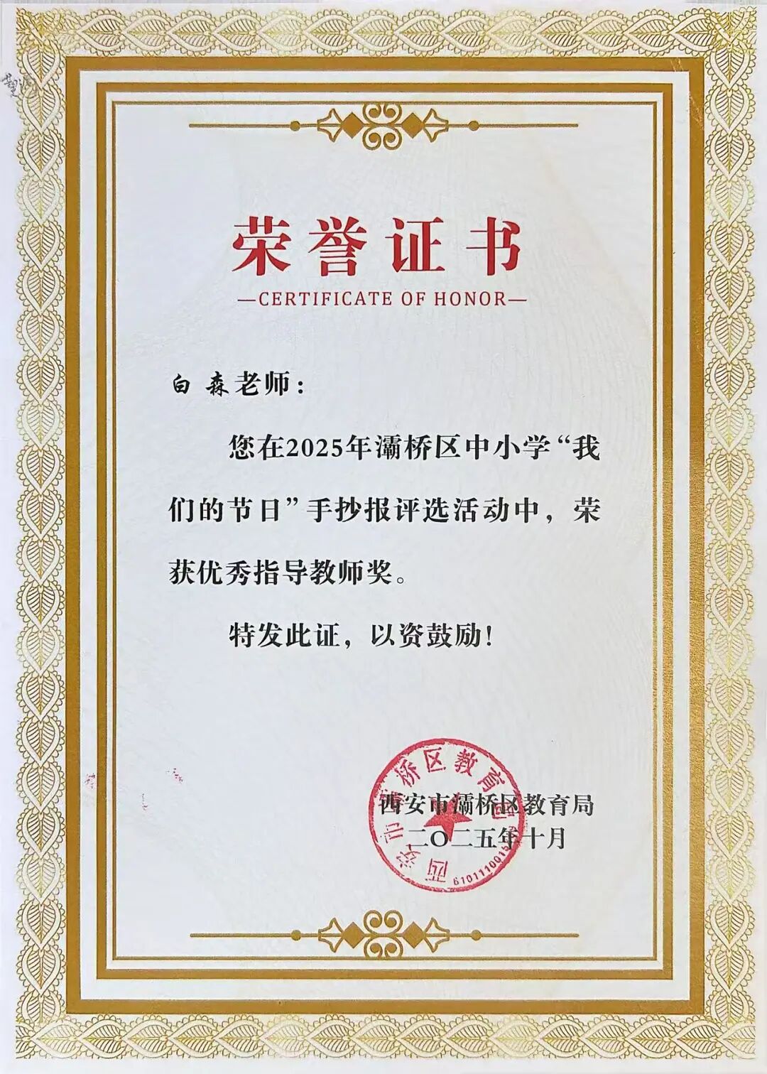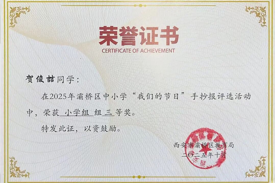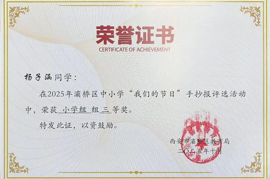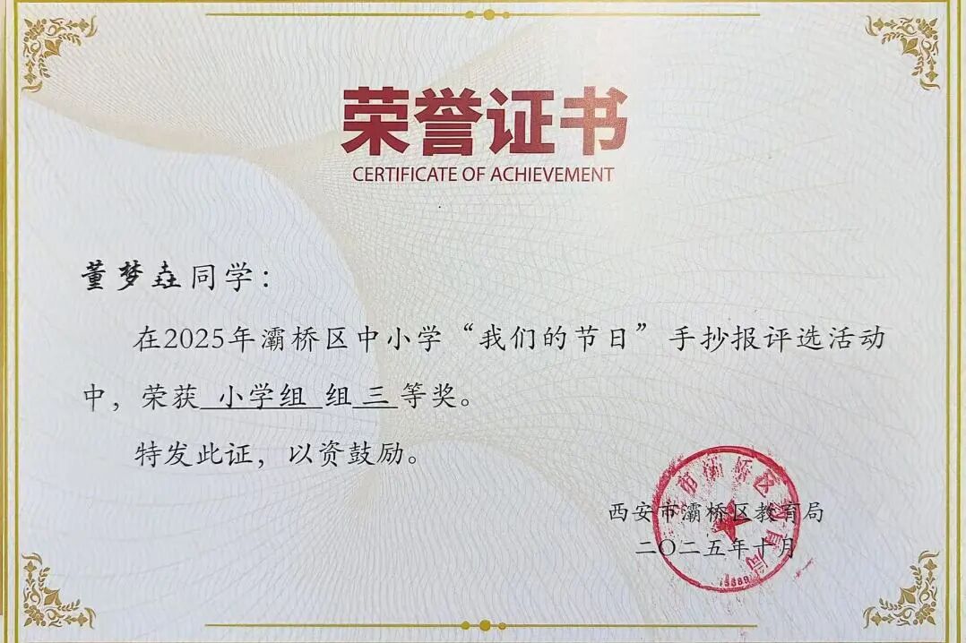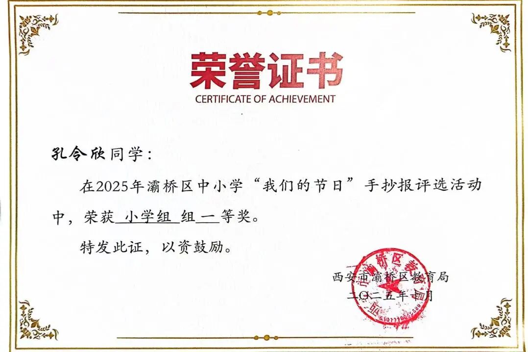 在2025年灞桥区中小学“我们的节日”手抄报评选活动中,灞桥区黄河锦绣小学师生凭借扎实的专业素养与出色的创作能力斩获佳绩:孔令欣同学荣获小学组一等奖;杨子涵、贺俊喆、董梦垚三位同学荣获小学组三等奖;白森老师荣获优秀指导教师奖。