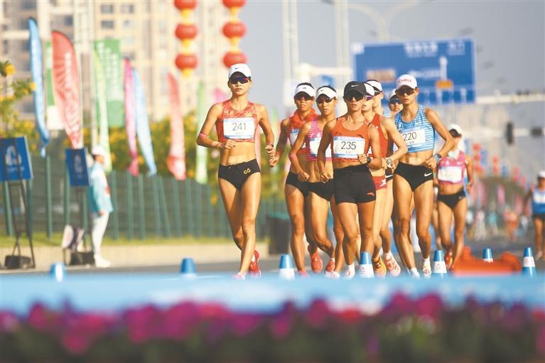 11月17日,第十五届全国运动会田径项目马拉松竞走混合接力决赛在广东省珠海市举行。陕西队选手李炎东、杨柳静搭档,以2小时58分40秒的成绩获得亚军。图为杨柳静(左一)比赛瞬间。