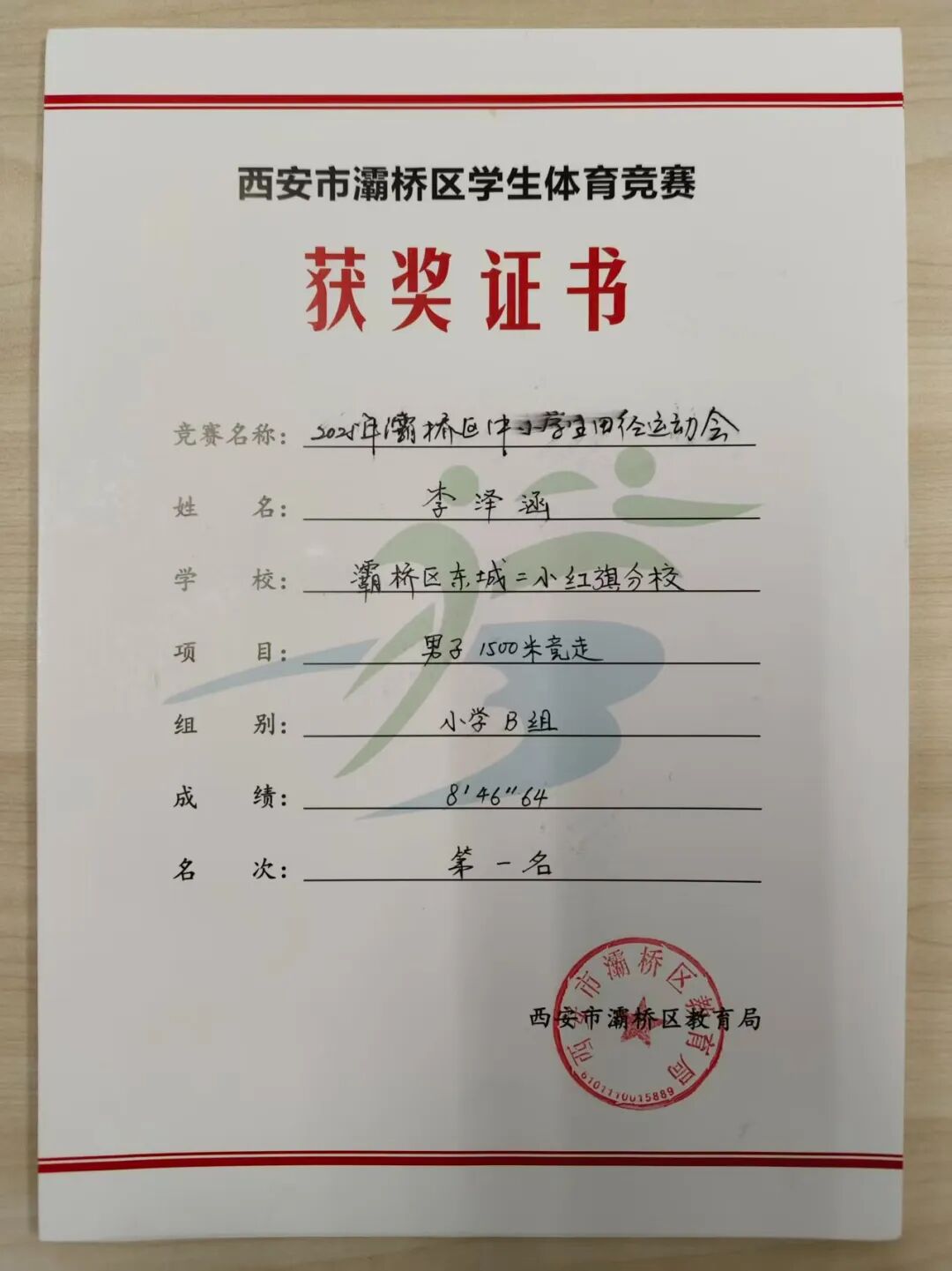 男子400米第一名 张芮鹏 男子800米第一名 李泽涵