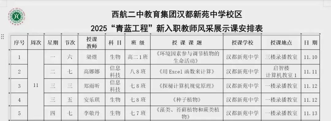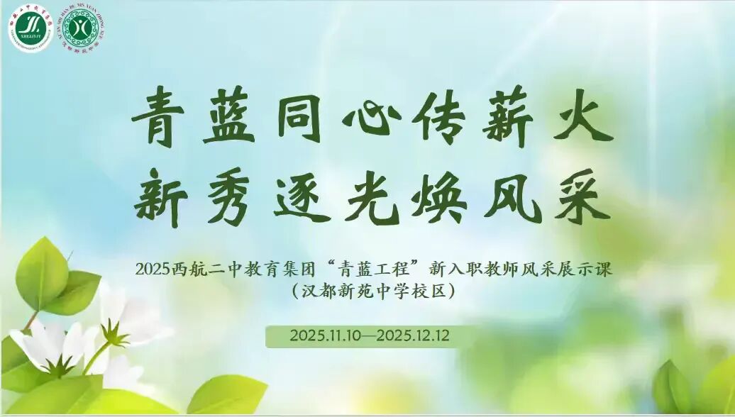秋光正好,笃行不怠。为深化西航二中教育集团汉都新苑校区教师队伍建设成果,紧跟集团“青蓝工程”培育步伐,西安市汉都新苑中学于11月10日至12月12日同步开展2025西航二中教育集团“青蓝工程”新入职教师风采展示课活动。