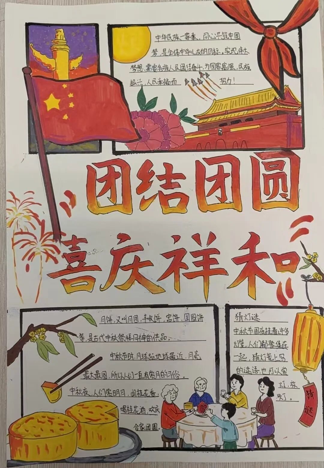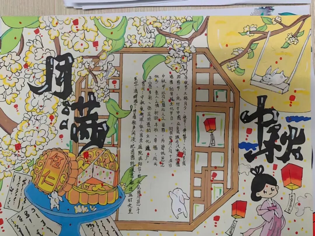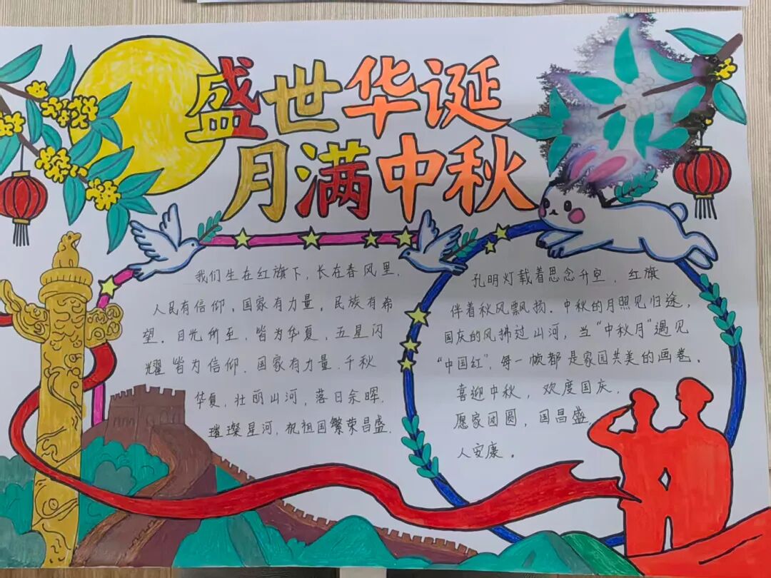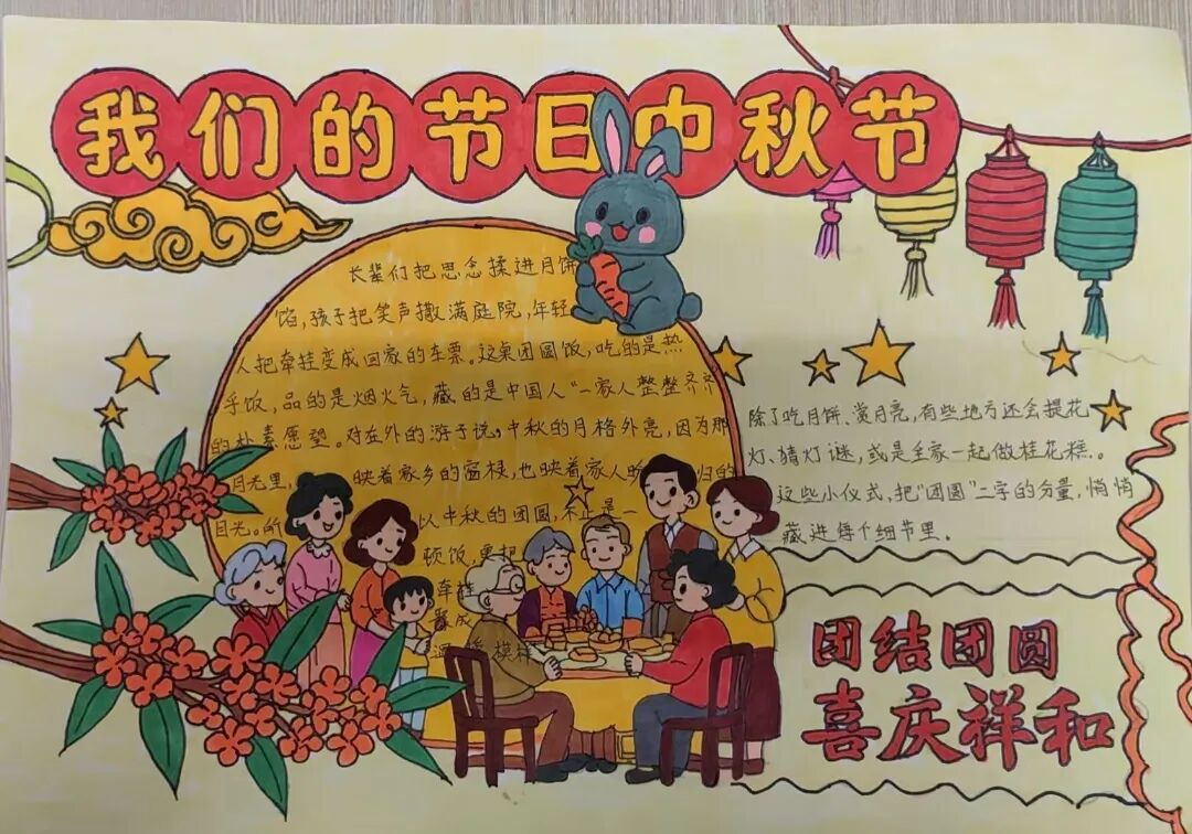 同学们紧扣“团结团圆、喜庆祥和”的主题,将所见所闻、所思所感,融汇于创意构思与斑斓画笔之中。那一幅幅图文并茂、构思精巧的手抄报作品,不仅展现了同学们良好的艺术素养,更生动诠释了人们对幸福团圆、家庭美满的美好期盼,绘就了一幅家国同庆、社会和谐的动人画卷,充分彰显了新时代少年昂扬向上的精神风貌。