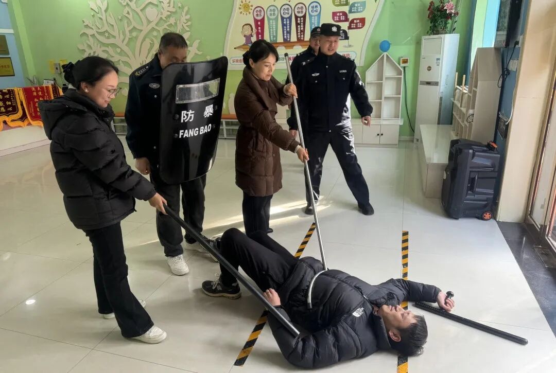 “预先处置,有备无患!”民辅警秉持“贴近实战、突出重点、快速反应”的原则,采用“教学+演练”相结合的模式,向来自各学校、幼儿园的30余名相关负责人及保安员,系统讲解了最小应急作战单元的构成要素和战术配合,并现场示范了盾牌、钢叉、警棍等常用防暴器械的正确使用方法。随后的实战演练环节,有效检验和提升了参训安保人员的快速反应、协同配合和高效处置能力。