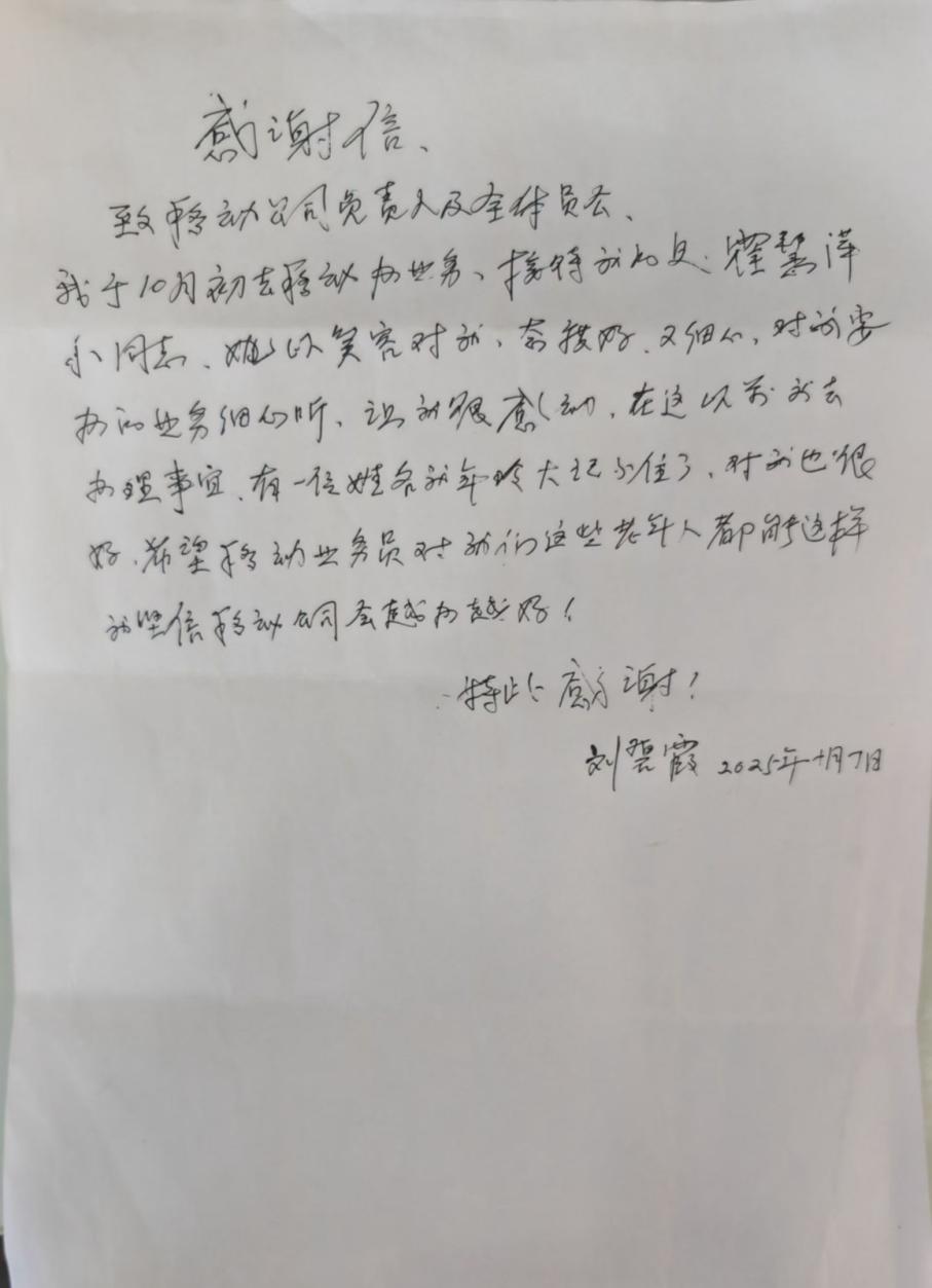 “希望移动的工作人员对我们这些老年人都能这样,也坚信移动公司会越来越好!”刘女士在信中写道。这是对西安移动适老服务的认可,也寄托着广大老年客户的美好期待。