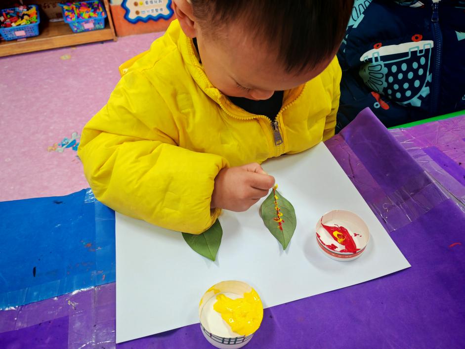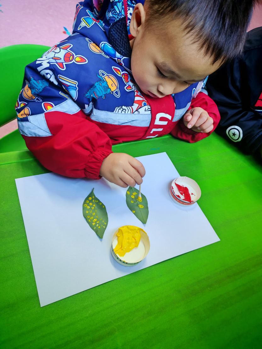 回到班级,创作环节正式开启。孩子们先将收集的树叶小心翼翼地粘贴在A4纸上,再拿起颜料笔,用鲜艳的色彩为树叶涂色点缀。有的给枫叶涂上渐变红,有的给梧桐叶画上彩色纹路,原本普通的落叶在孩子们的巧手下变成了一幅幅生动的秋日画作。老师在旁耐心指导,鼓励孩子大胆发挥想象力。