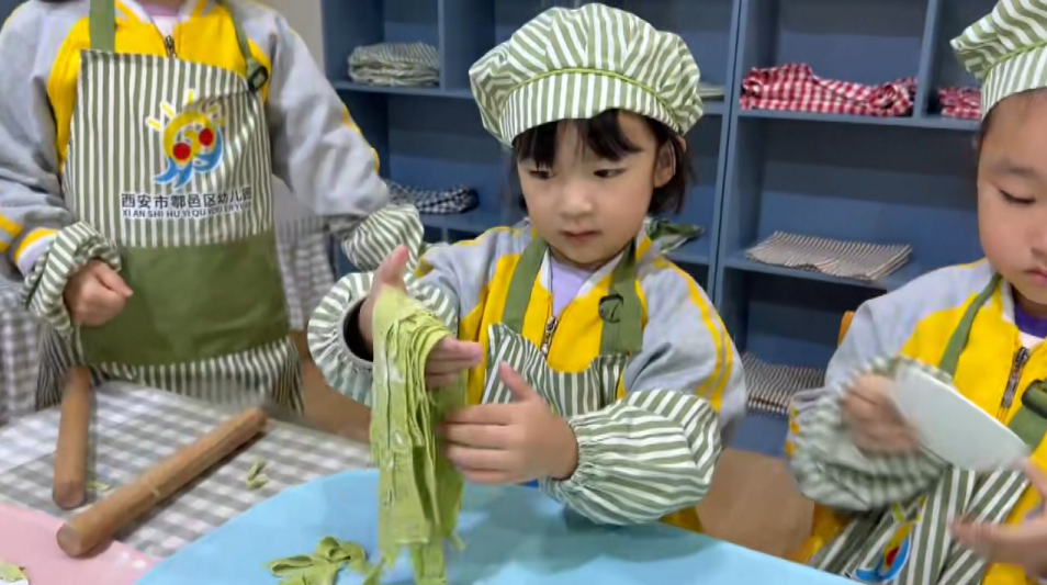 11月20日,记者走进鄠邑区幼儿园里看到,一群萌娃熟练地系上围裙,套上袖套,戴上厨师帽,变身“小小美食家”,在充满烟火气的小厨房里开启了奇妙的劳动探索之旅。在老师的指导下,从择菜、洗菜、榨汁到和面、擀面,现场忙碌有序,小厨师们的操作也有模有样,运用揉、擀、切、扯等技巧将手中的面团揉圆、擀开、切条,制作成可口的美食。除了菠菜面、麻食,月饼、粽子、水果捞、红薯干等都是孩子们的“创作素材”。老师们从各类食材的特点、用途,到精确的配比,再到复杂的制作流程,每一个细节都毫无保留、细致入微地传授给孩子们。