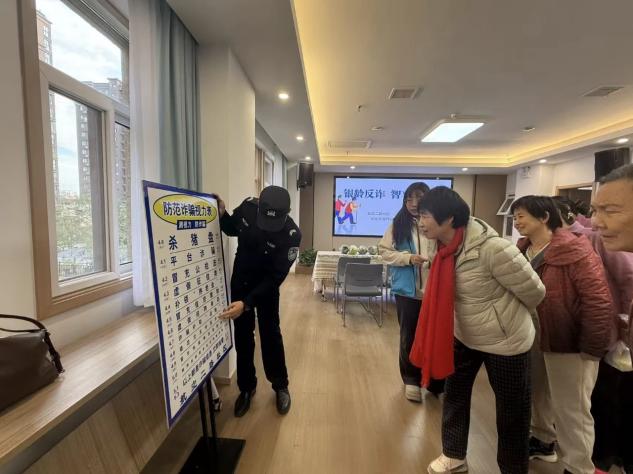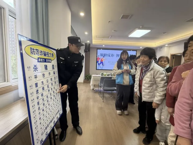 另一边的“反诈视力表”前同样热闹,民警和社区工作人员引导老人逐行念出“补领养老金”“高息理财”等诈骗关键词。“这个‘补领养老金’我得划重点,上次就有人打电话跟我说能多领钱!”李集成念完后恍然大悟,当即和身边老人分享此前的遭遇。