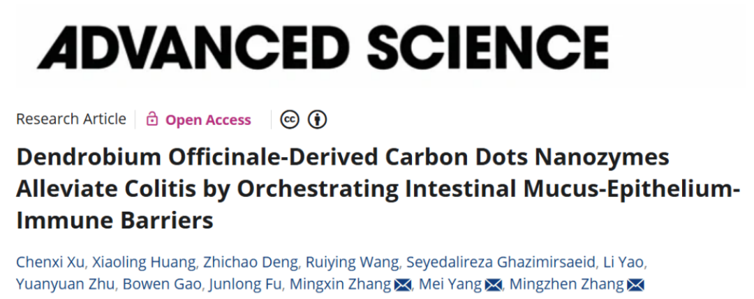 阳光讯(记者 郑亚雷 通讯员 王莉)近日,西安医学院第一附属医院副院长张明鑫研究团队与西安交通大学医学部基础医学院张明真研究员团队合作的课题在国际知名期刊《Advanced Science》杂志(IF 14.1)上发表了题为“Dendrobium Officinale-Derived Carbon Dots Nanozymes Alleviate Colitis by Orchestrating Intestinal Mucus-Epithelium-Immune Barriers”的研究论文,在这项工作中,研究团队设计了一种类酶活性的碳点(DO-CDs),通过减少肠道组织中炎症细胞的浸润、促进结肠杯状细胞增殖、上调紧密连接蛋白表达,重构结肠免疫稳态,实现对结肠黏膜屏障、上皮屏障及免疫屏障的修复,进而显著抑制结肠炎进展。