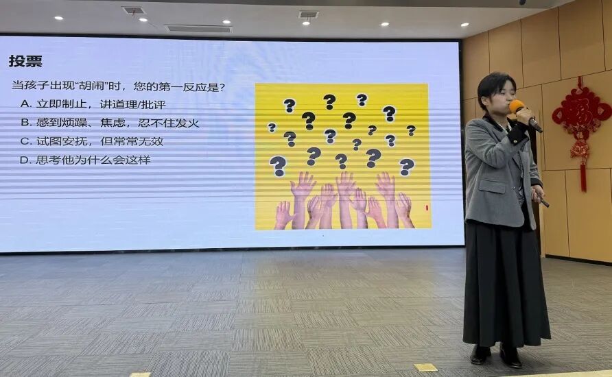 “大家不妨现在试试,一分钟内你能拍多少次手?”讲座一开始,心理专家便以一个简单有趣的互动游戏,瞬间点燃了现场氛围。家长们纷纷参与其中。