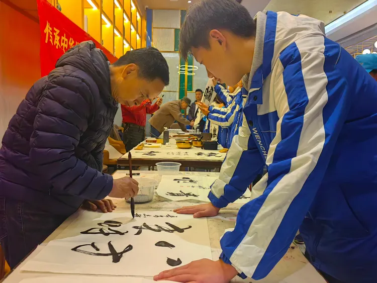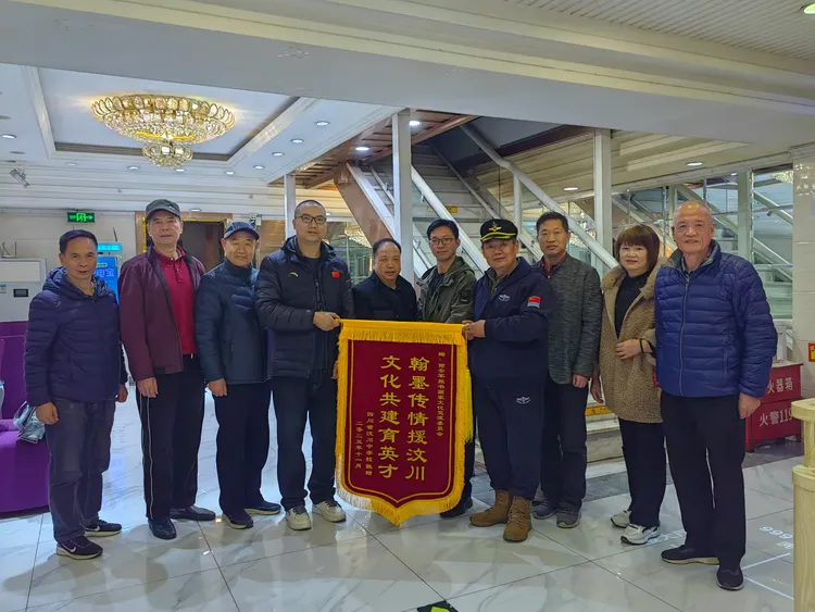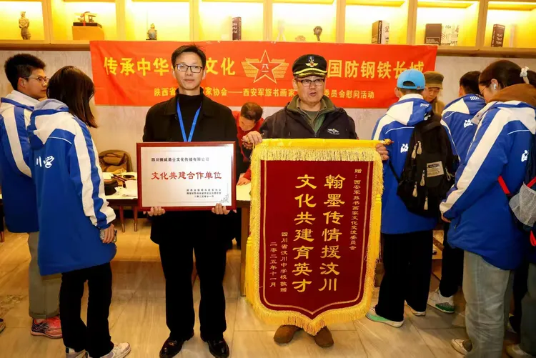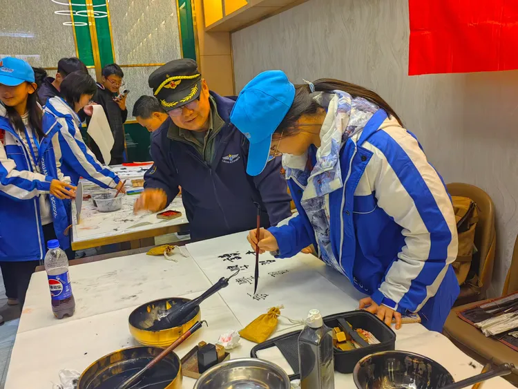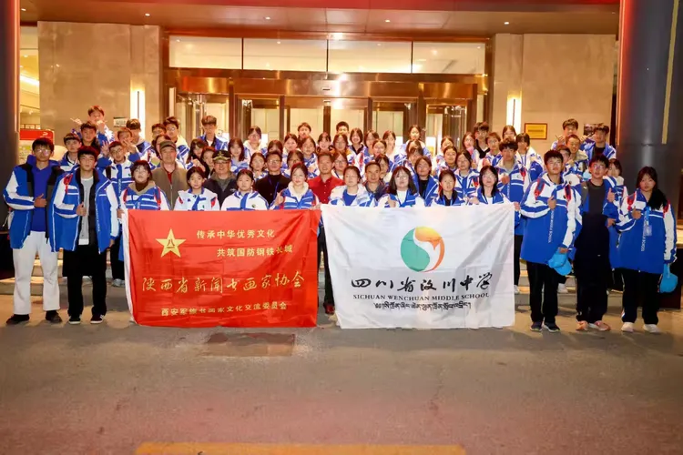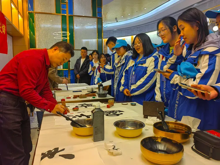 阳光讯(记者 韩文韬 实习记者 王义卓)2025年11月22日晚上,西安市华美达酒店大厅内。由四川振威勇士文化传播有限公司董事长王本勇和总经理唐晓雪组织带队的四川汶川中学的60名研学学生,与陕西省新闻书画家协会西安军旅书画家文化交流委员会,孙利、李志锋、舒强、岳林海等军旅书画家,以及委员会宣传部长周峰川等,进行了一场书画交流互动活动,得到了师生和住店游客们的阵阵掌声。