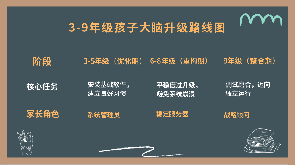 唐凯老师指出,3-9年级是孩子大脑的“系统升级”关键期。8-11岁时,大脑处于“系统优化期”,这是培养好习惯的黄金阶段,家长要像“系统管理员”一样,帮孩子建立规则。12-14岁进入“系统重构期”,孩子情绪波动大,家长则要成为“稳定服务器”,提供情绪支持。15岁以上是“系统整合期”,家长需转为“战略顾问”,引导孩子走向独立。