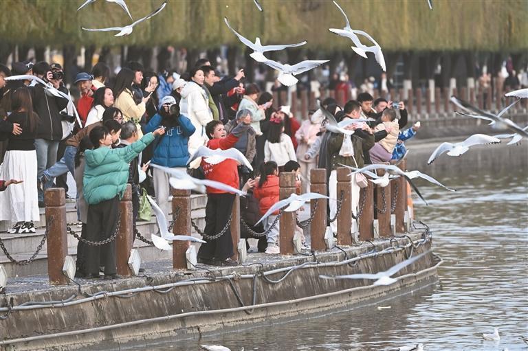 11月19日,市民游客在天汉湿地公园与红嘴鸥互动。记者 段承甫摄