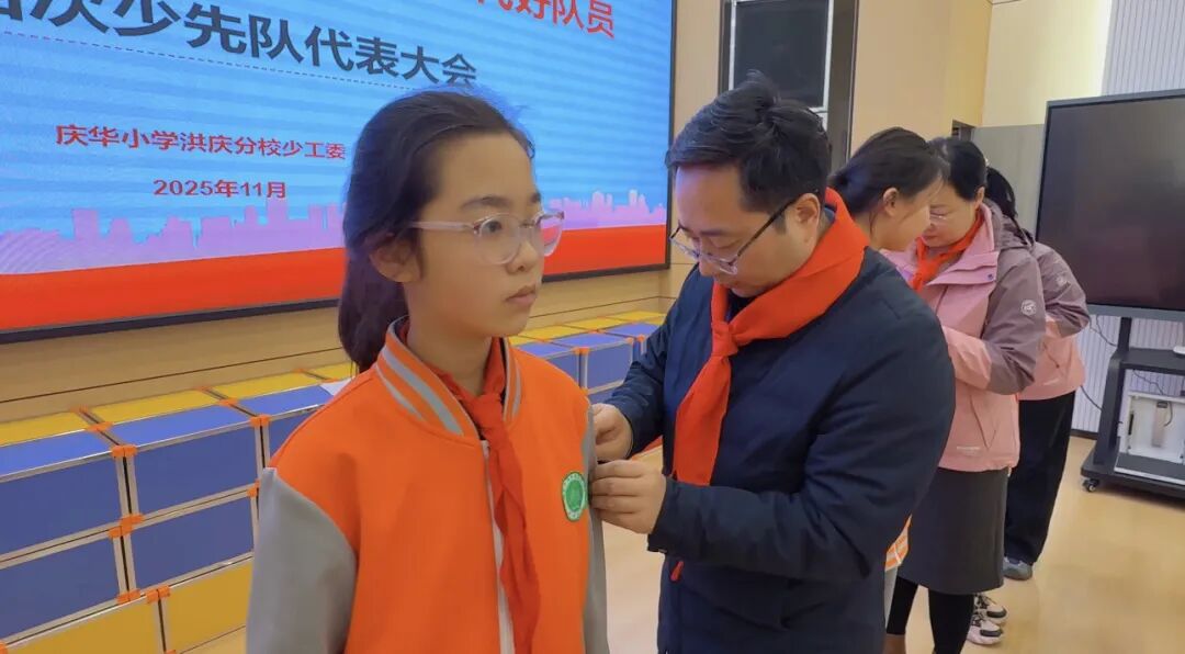 大会接续初心、薪火相传,后勤服务中心主任贺王彬宣读新一届大队委员名单,8位同学成功当选。与会领导为新当选的大队委员佩戴队干部标志,一枚枚标志承载荣誉与责任,全场掌声雷动,共同见证这一光荣时刻。